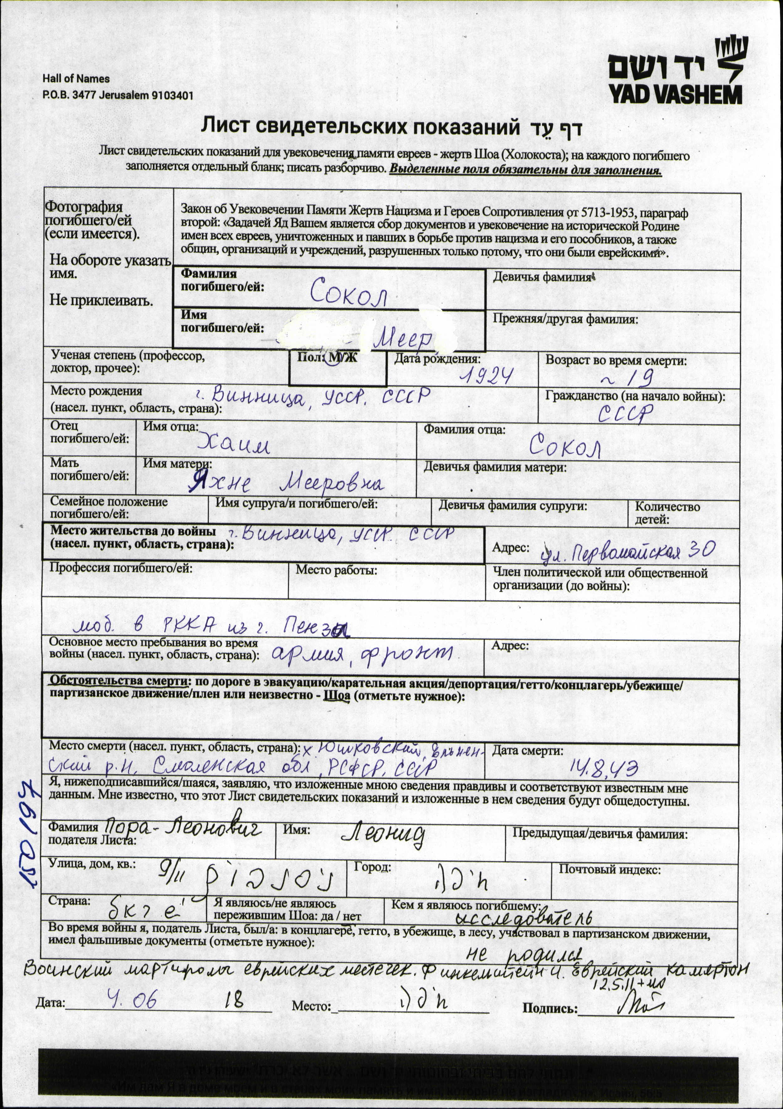 Сокол Меер Винница, Украина (СССР) Лист свидетельских показаний