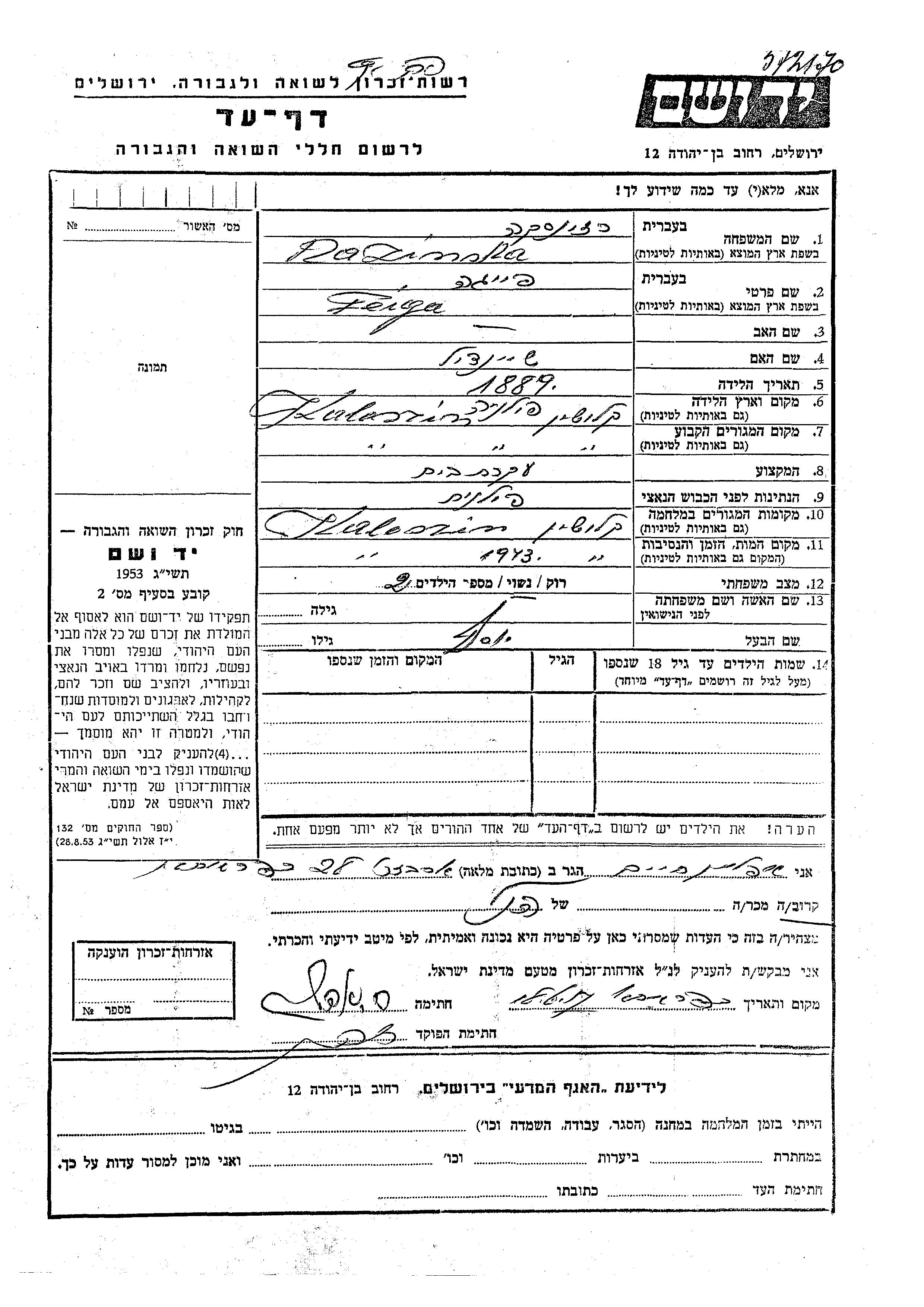 Яд Вашем - Листы свидетельских показаний Мемориального фонда