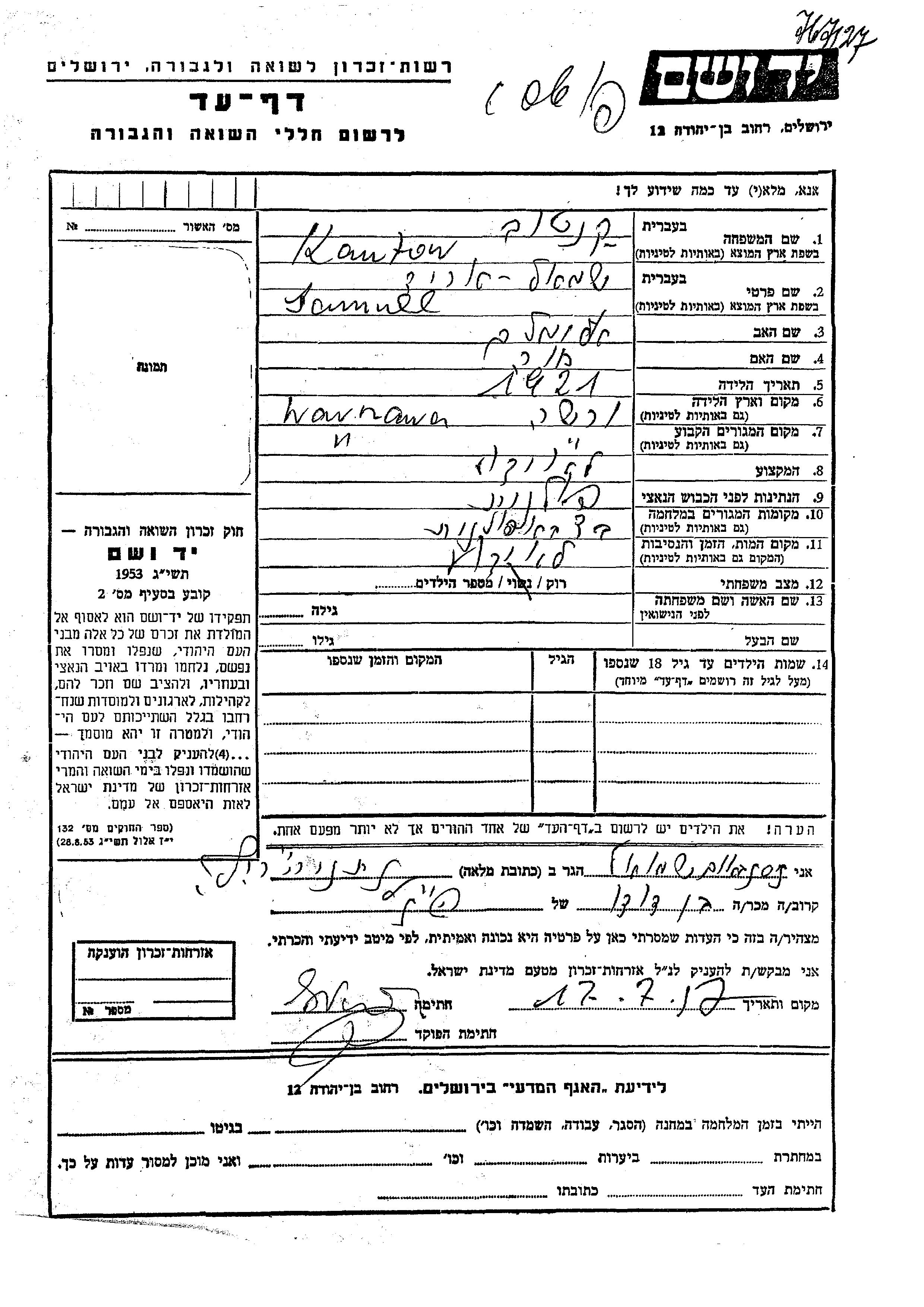 Шмуэль Арье Кантов, место рождения: Варшава, Польша. Отец: Элимелех, mать:Хава. Холост / не замужем. Место жительства до войны: Варшава, Польша. Место во время войны: Вооруженные силы Польши.
