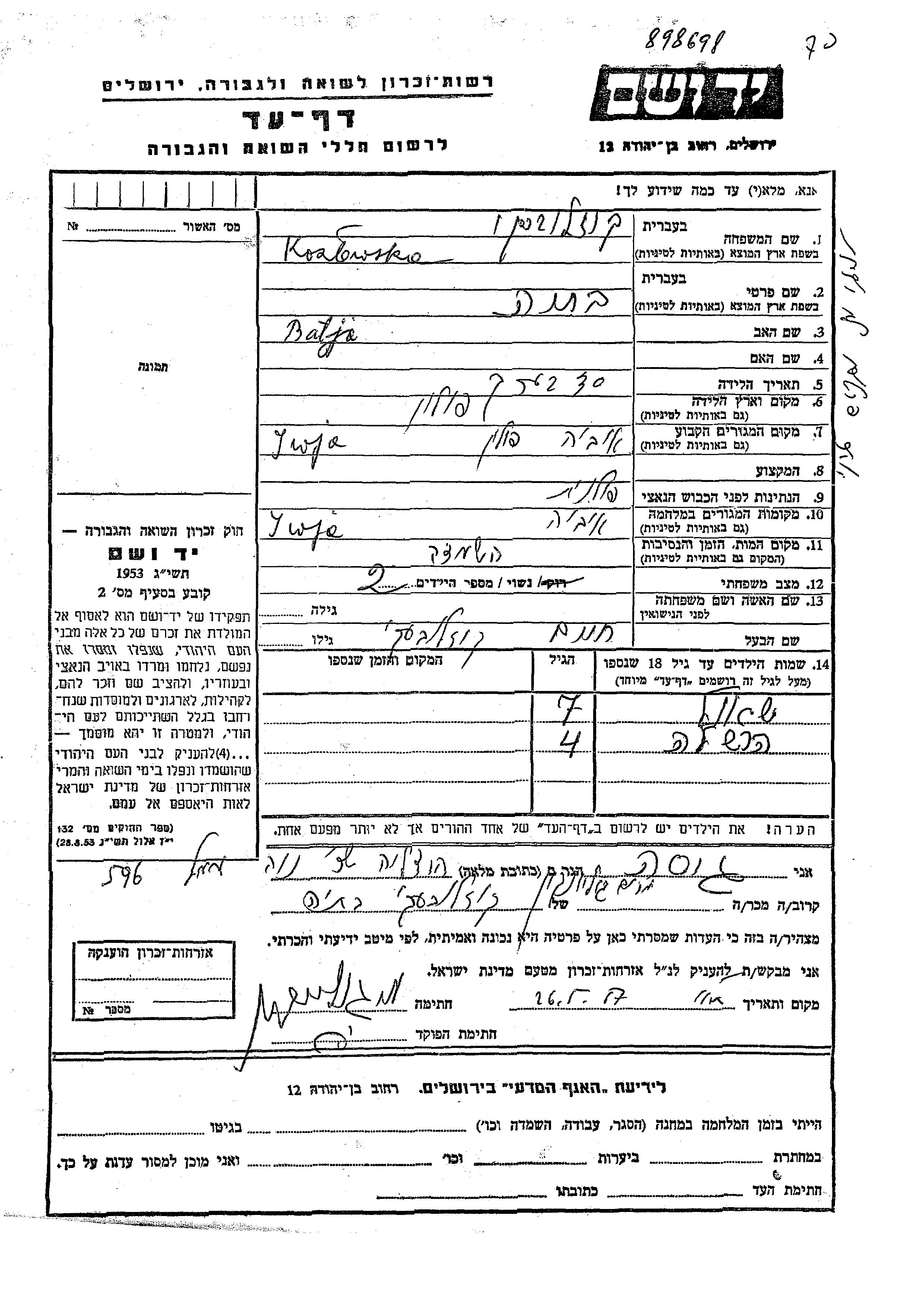 Батья Козловска, место рождения: Польша. Женат / замужем. Место жительства до войны: Ивье, Польша. Место во время войны: Ивье, Польша.
