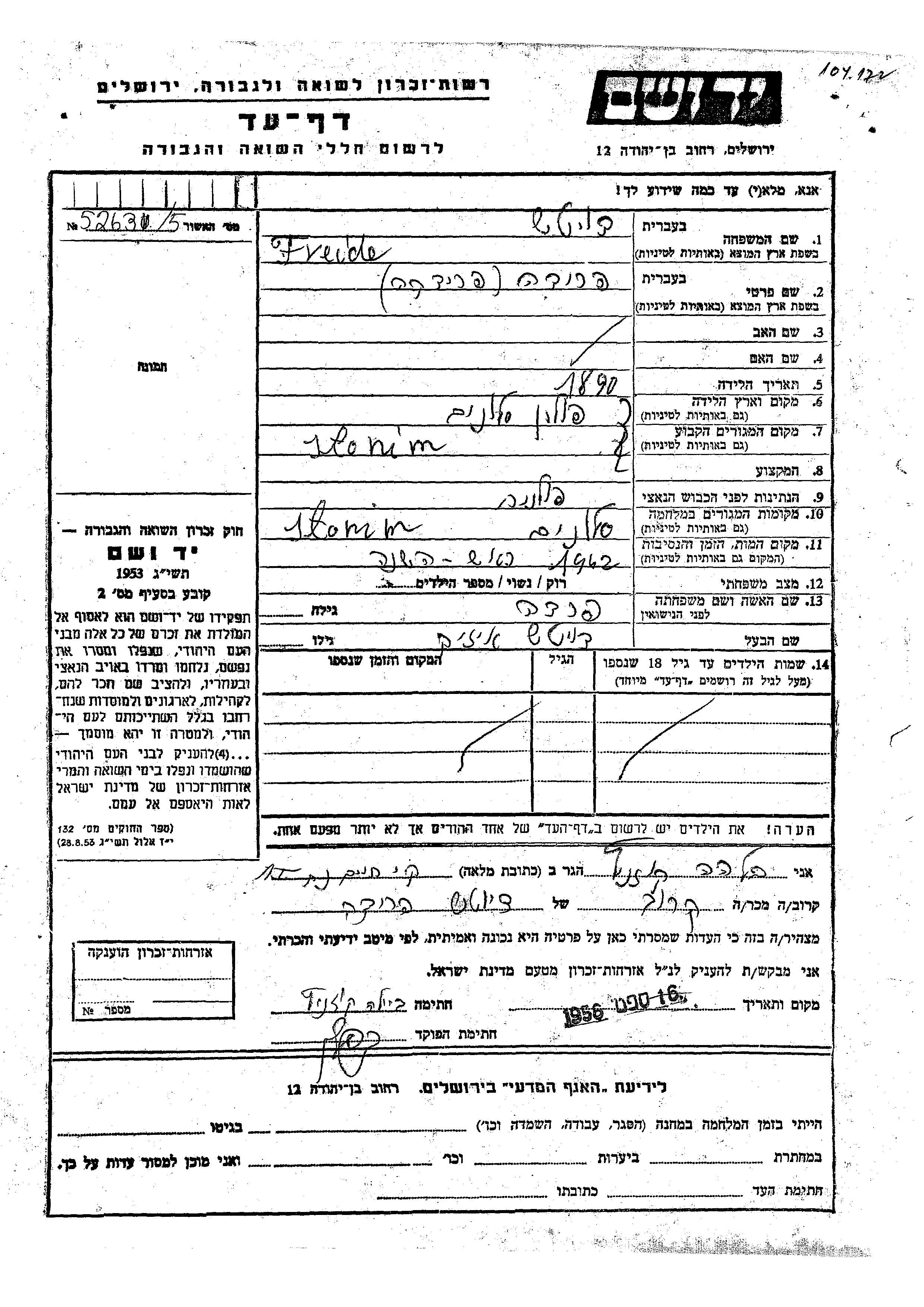 Дойч Фрида Фрейда 1890 Слоним, Польша Лист свидетельских показаний