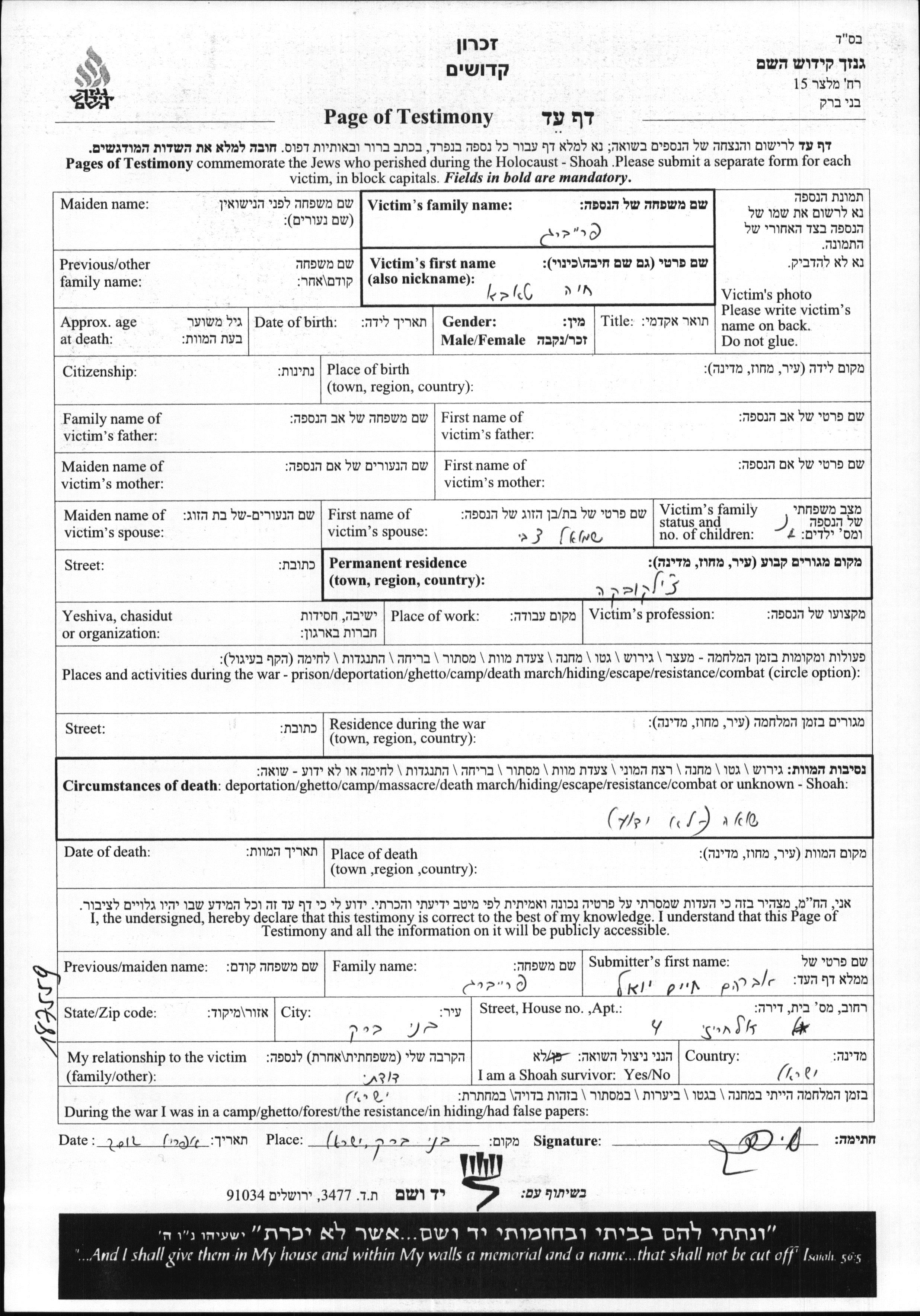 Яд Вашем - Листы свидетельских показаний Мемориального фонда