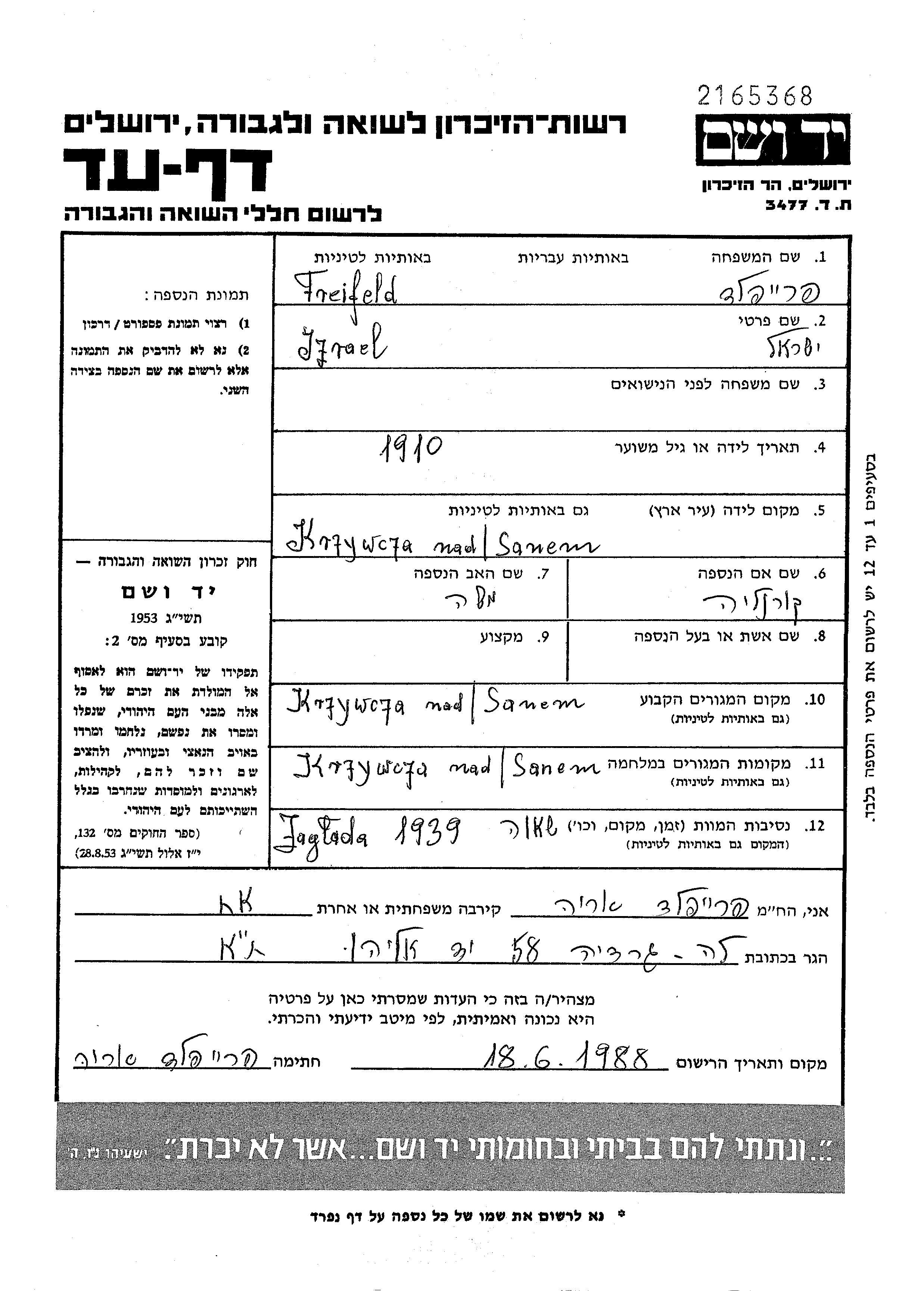 | Фрейфельд | Израэль | 1910 | Кшивча, Польша | Лист свидетельских показаний |