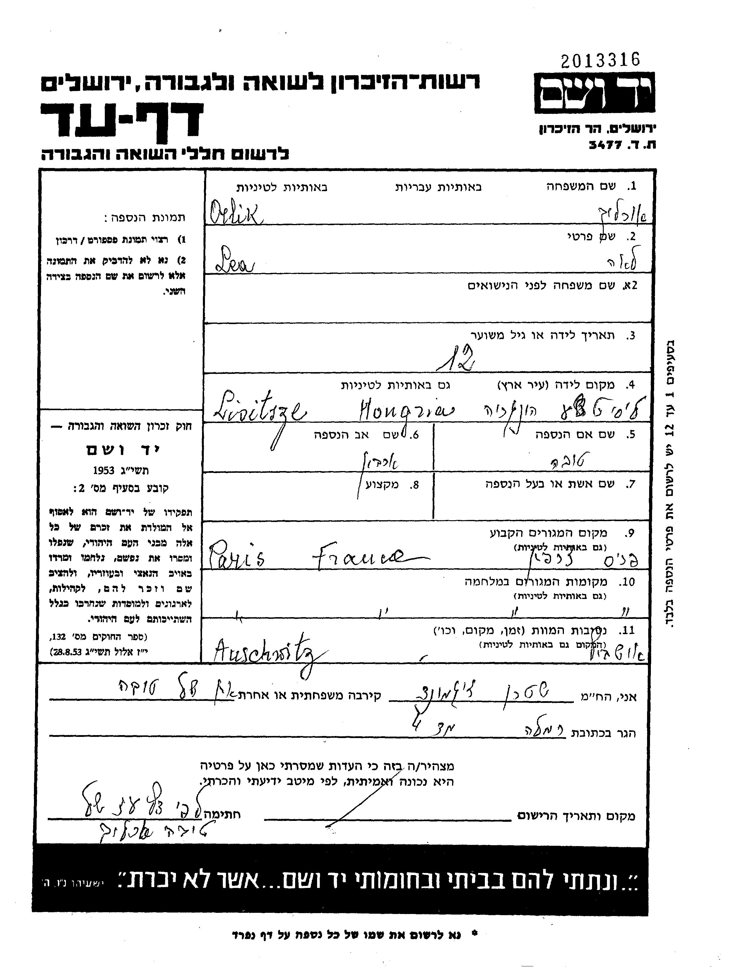 | Орлик Урлих | Лея | Париж, Франция | Лист свидетельских показаний | |