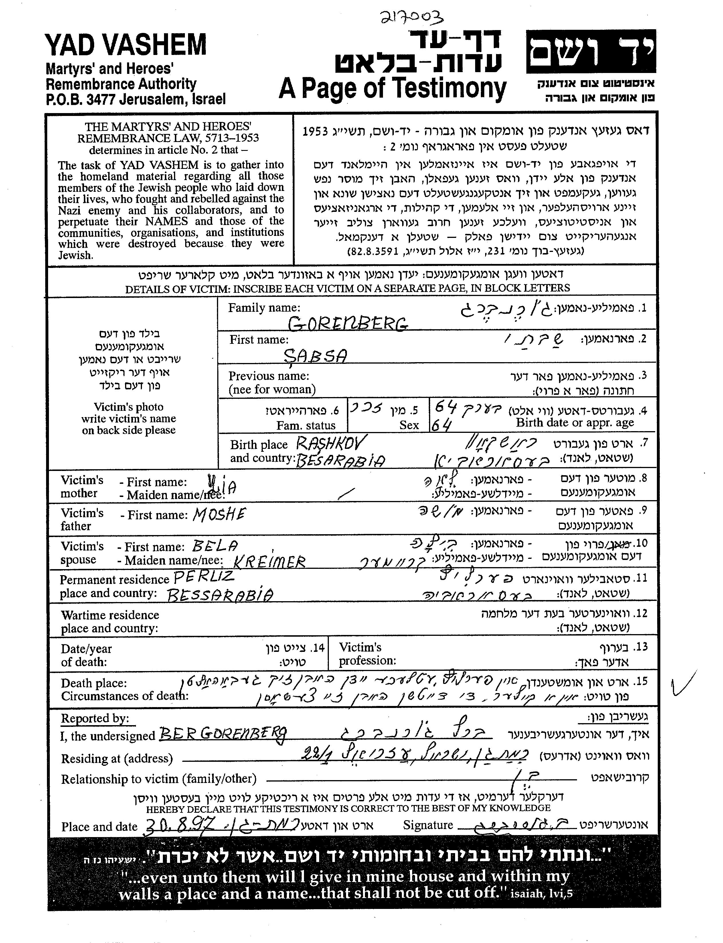 Горенберг Шабса Пырлита, Румыния Лист свидетельских показаний