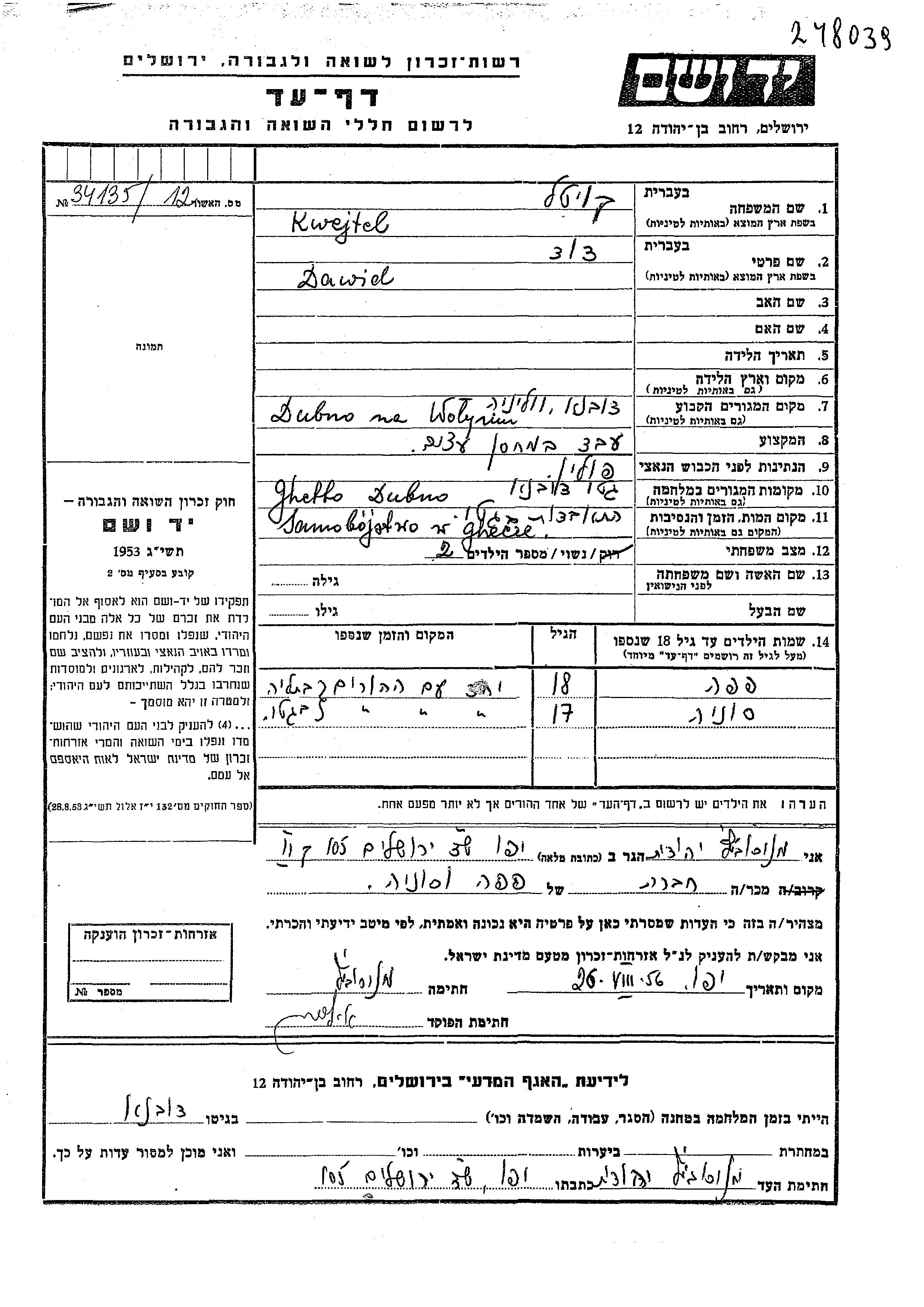 Давид Квейтель. Кладовщик. Женат / замужем. Место жительства до войны: Дубно, Польша. Место во время войны: Дубно, Польша.