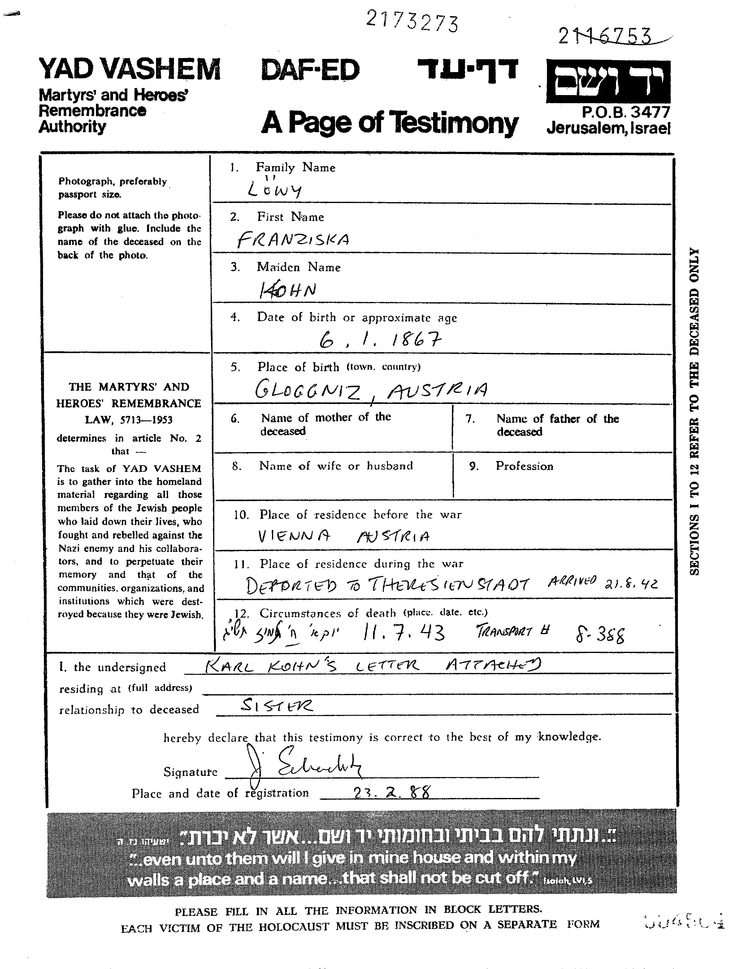 Франциска Лёви, девичья фамилия Кон, место рождения: Глогниц, Австрия. Место жительства до войны: Вена, Австрия.