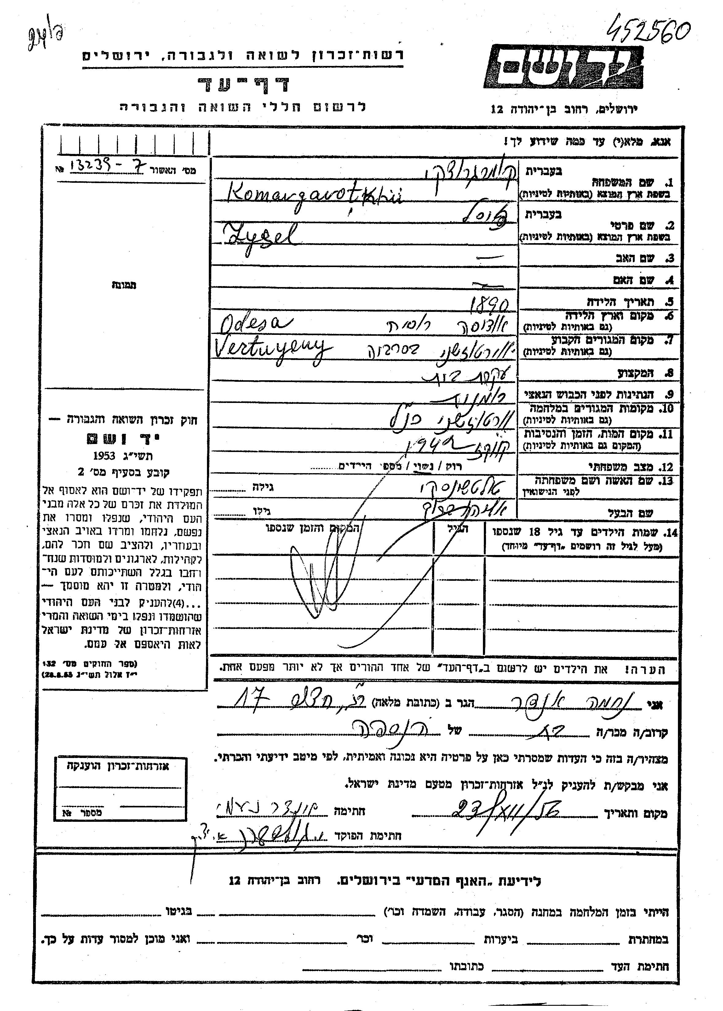 Комаргороцки Анцер Нехама Вертюжаны, Румыния Лист свидетельских показаний
