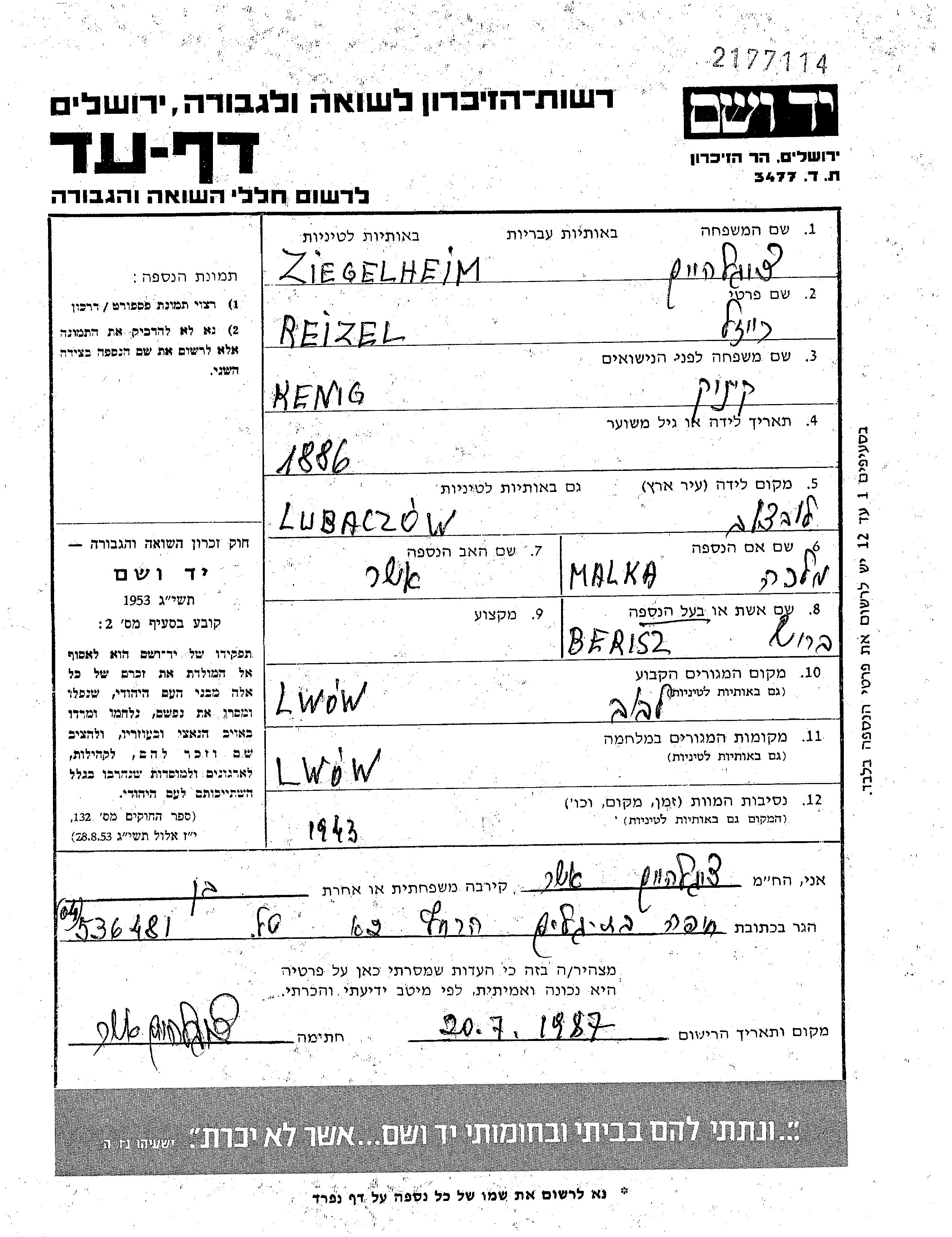 Цигельхейм | Рейзл | Львов, Польша | Лист свидетельских показаний |