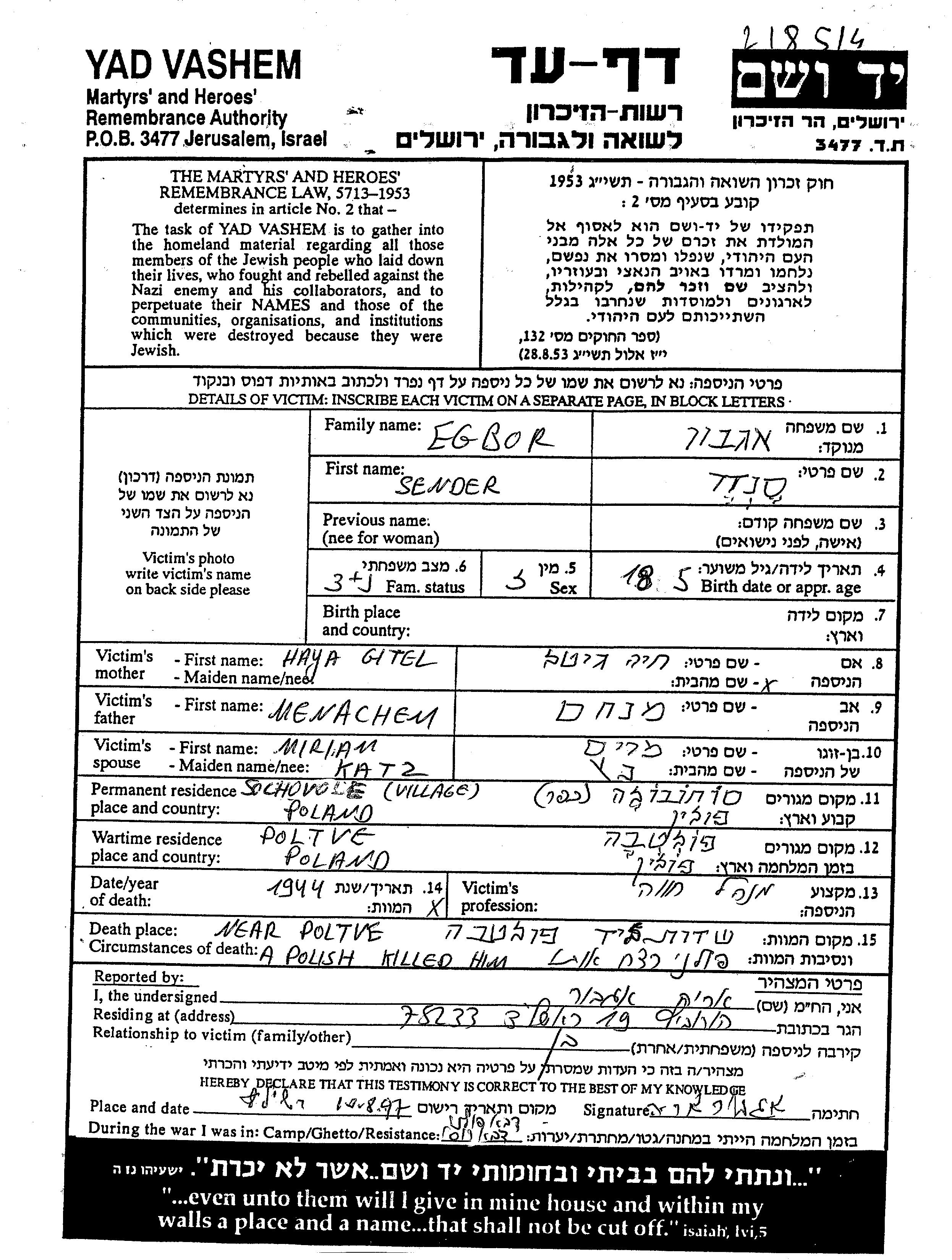 Эгбор | Сендер | Суховоля, Польша | Лист свидетельских показаний | |