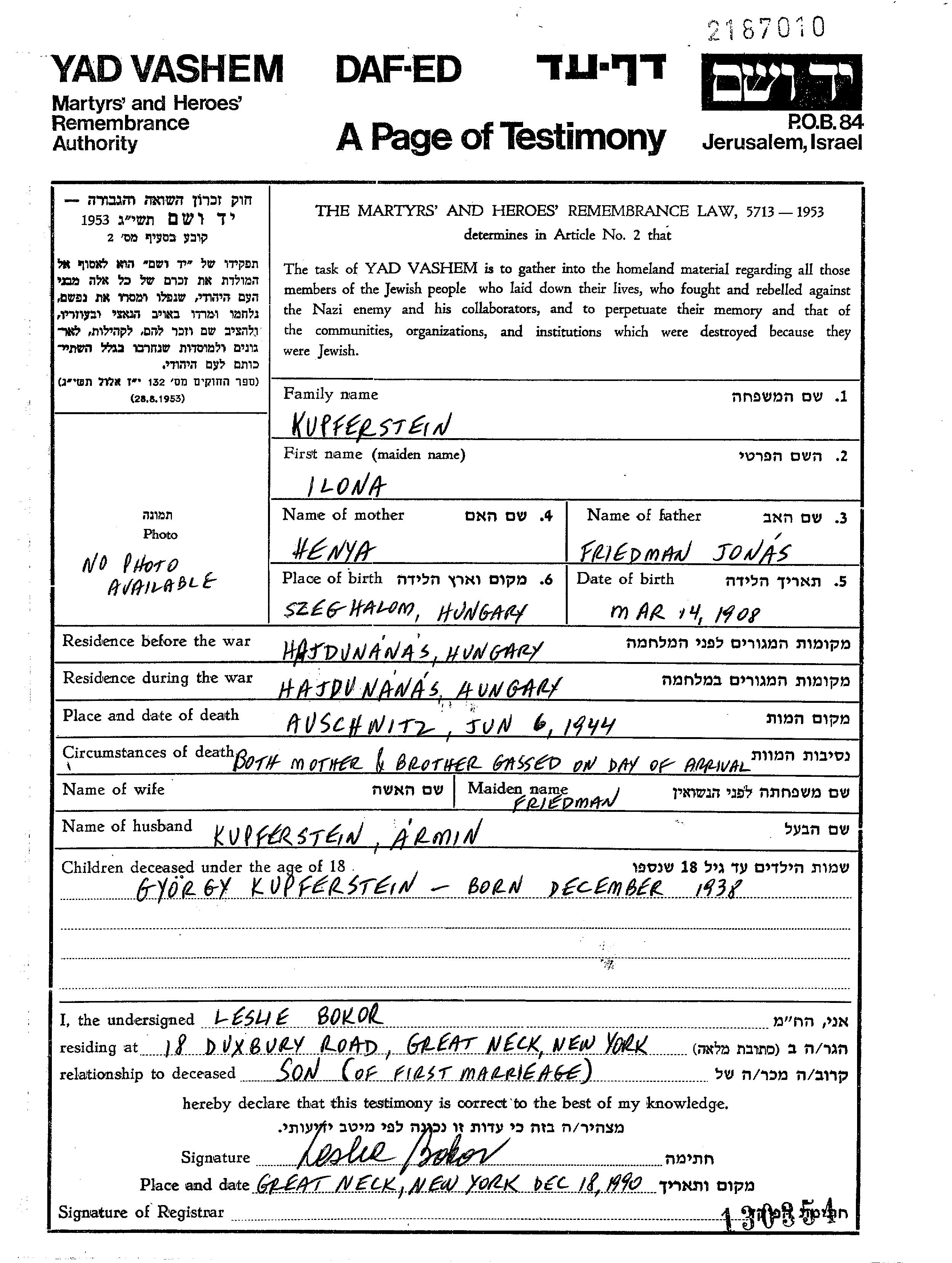 Илона Купферштайн, девичья фамилия Фридманн, место рождения: место не указано. Место жительства до войны: Хайдунанаш, Венгрия. Илона уничтоженa в период Шоа. место смерти: Аушвиц, Польша в 06/06/1944.