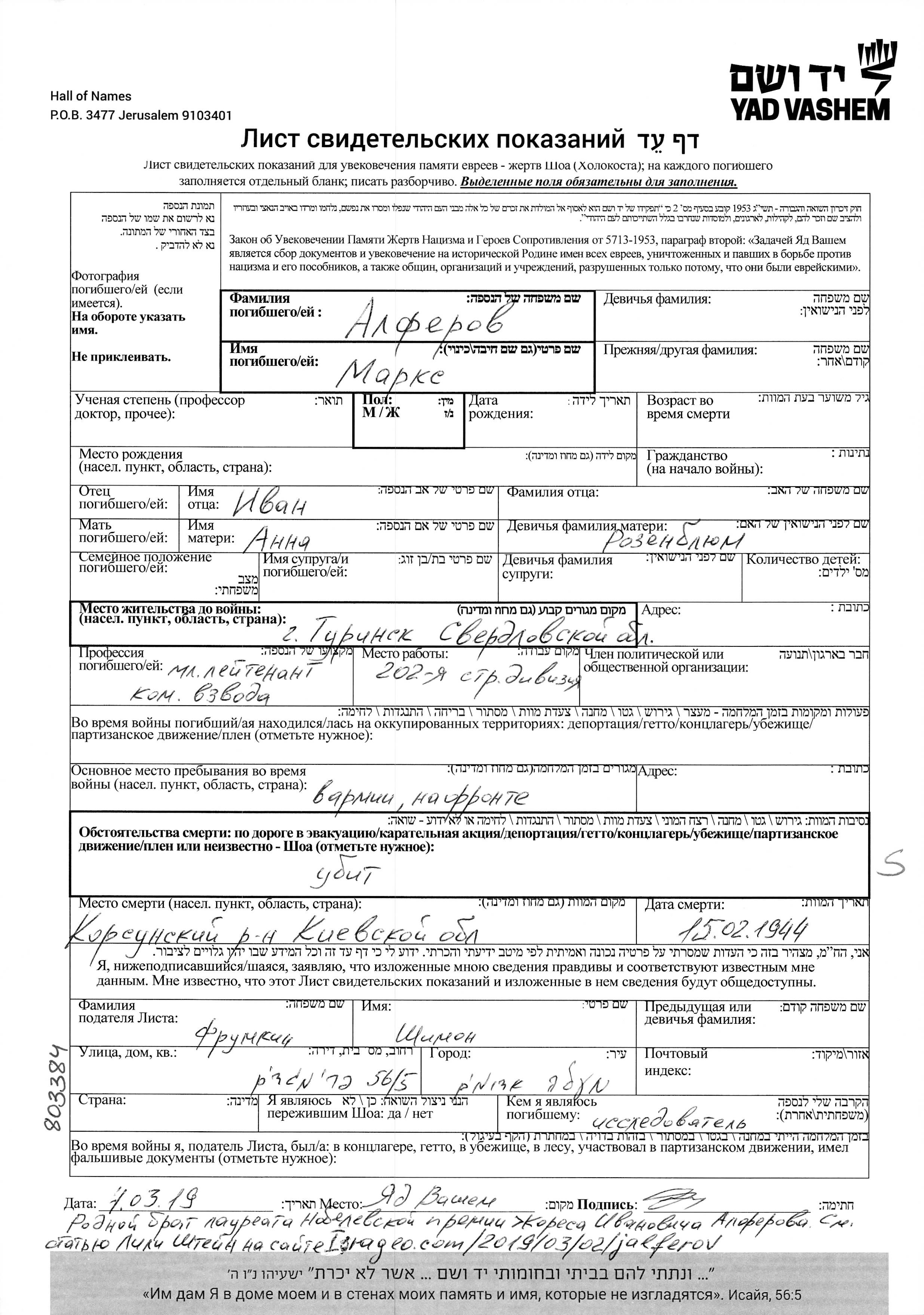 | Алферов | Маркс | Туринск, Россия (СССР) | Лист свидетельских показаний | |