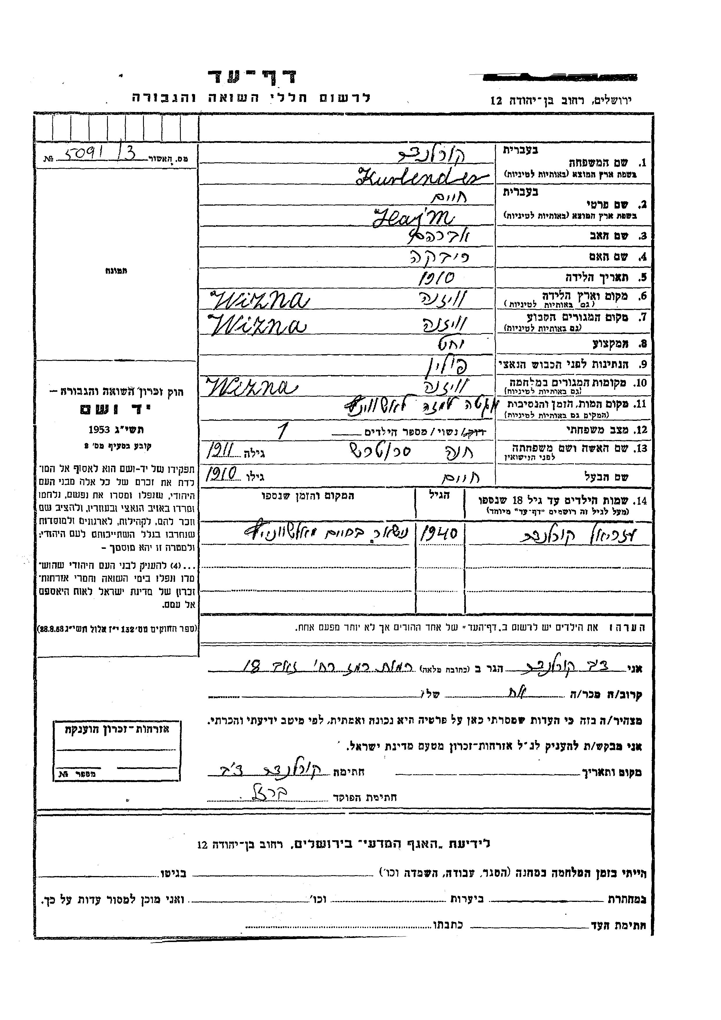 Дов Курлендер. Место жительства до войны: Визна, Польша.