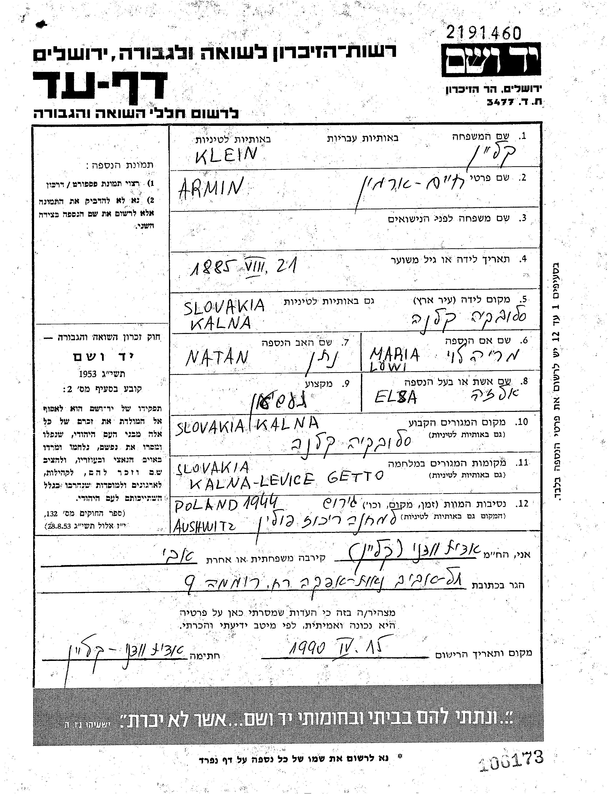 Клейн Армин Хаим 1885 Кальна, Чехословакия Лист свидетельских показаний