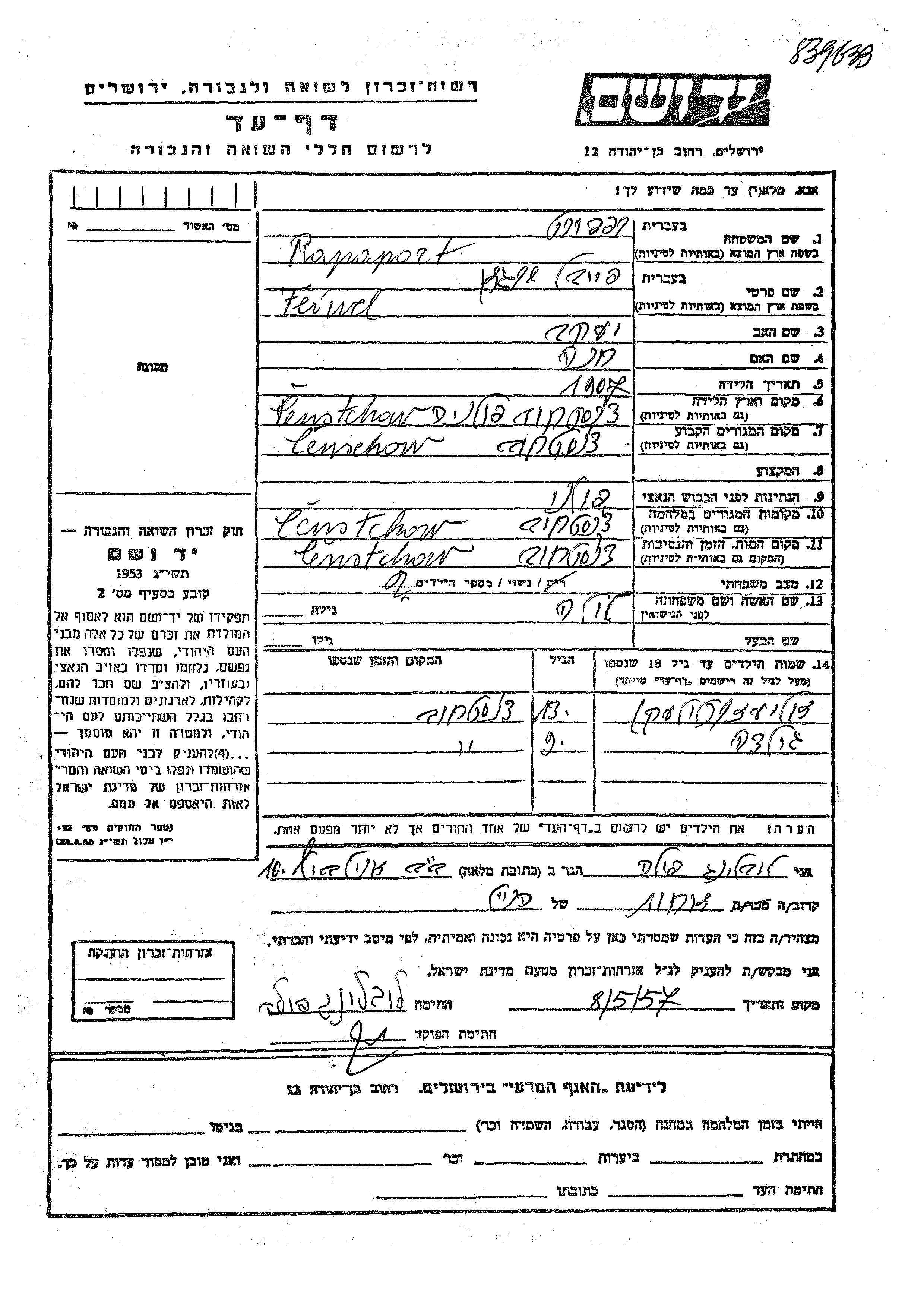 Рапопорт Пола 1924 место не указано, Анкета для переживших Шоа, эвакуированных и беженцев
