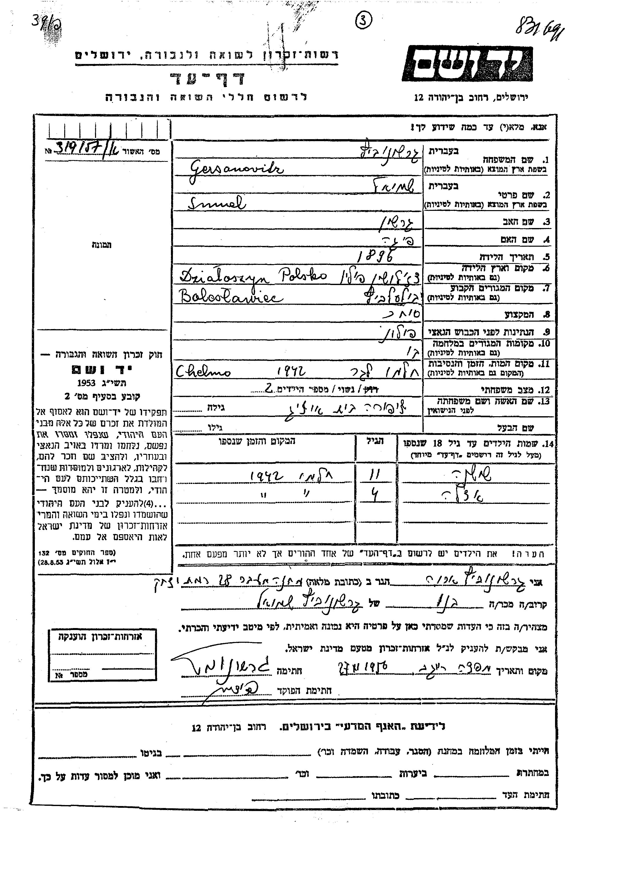 Шмуэль Герсановиц, место рождения: Дзялошин, Польша. Отец: Гершон, mать:Фейга. Торговец / торговка. Женат / замужем. Место жительства до войны: Болеславец, Польша. Место во время войны: Болеславец, Польша.