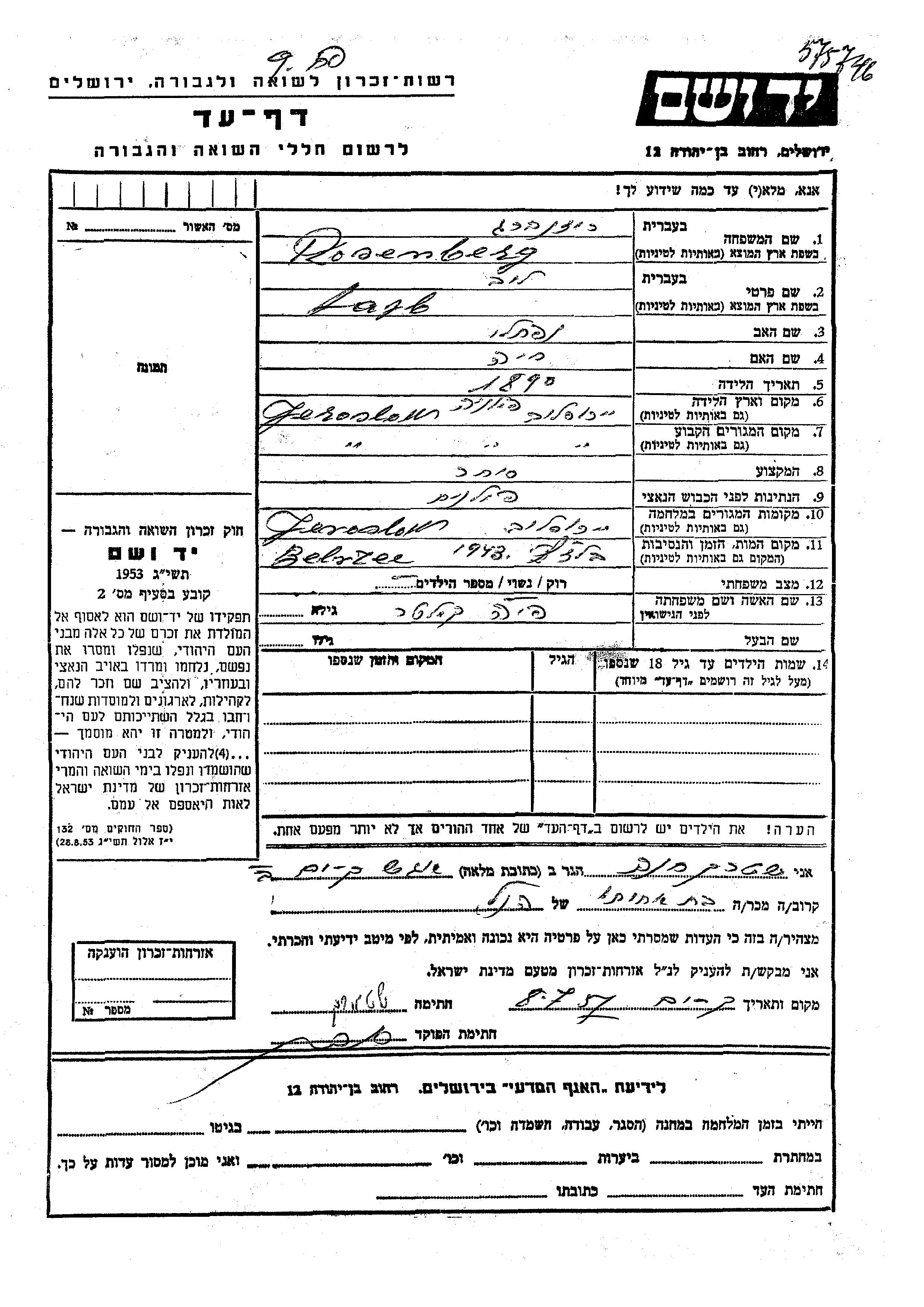 Розенберг Лайб 1890 Ярослав, Польша Лист свидетельских показаний