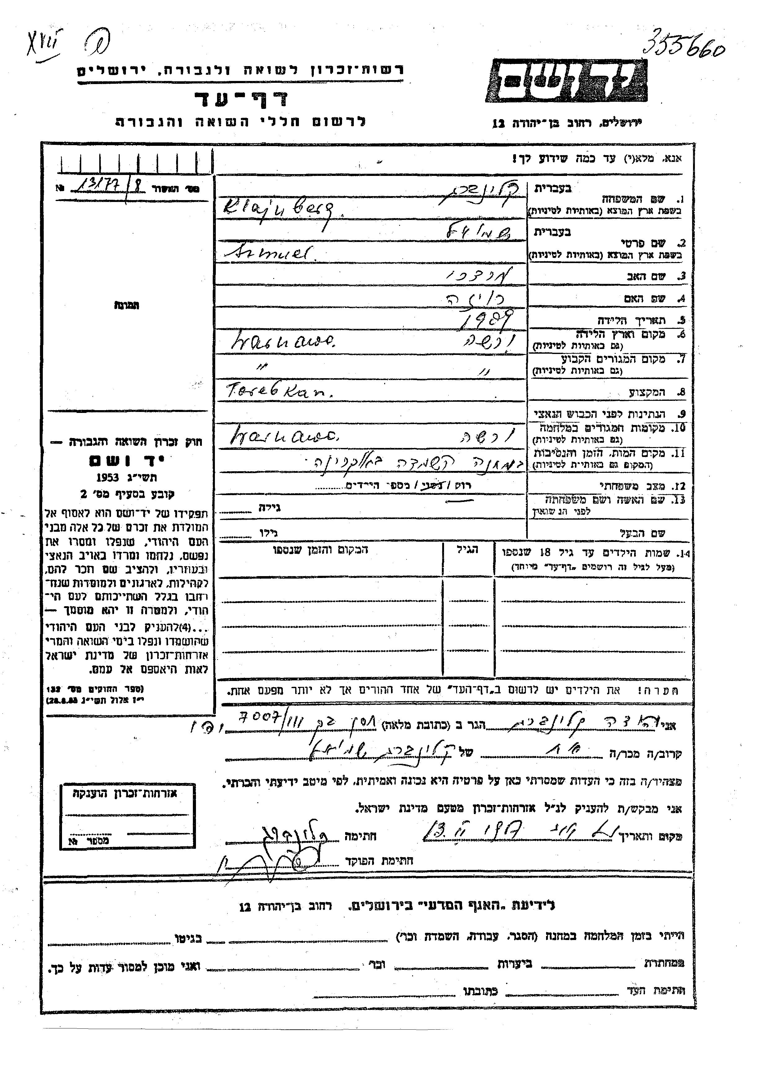 Клайнберг Клинберг Шмуэль 1909 Варшава, Польша Лист свидетельских показаний