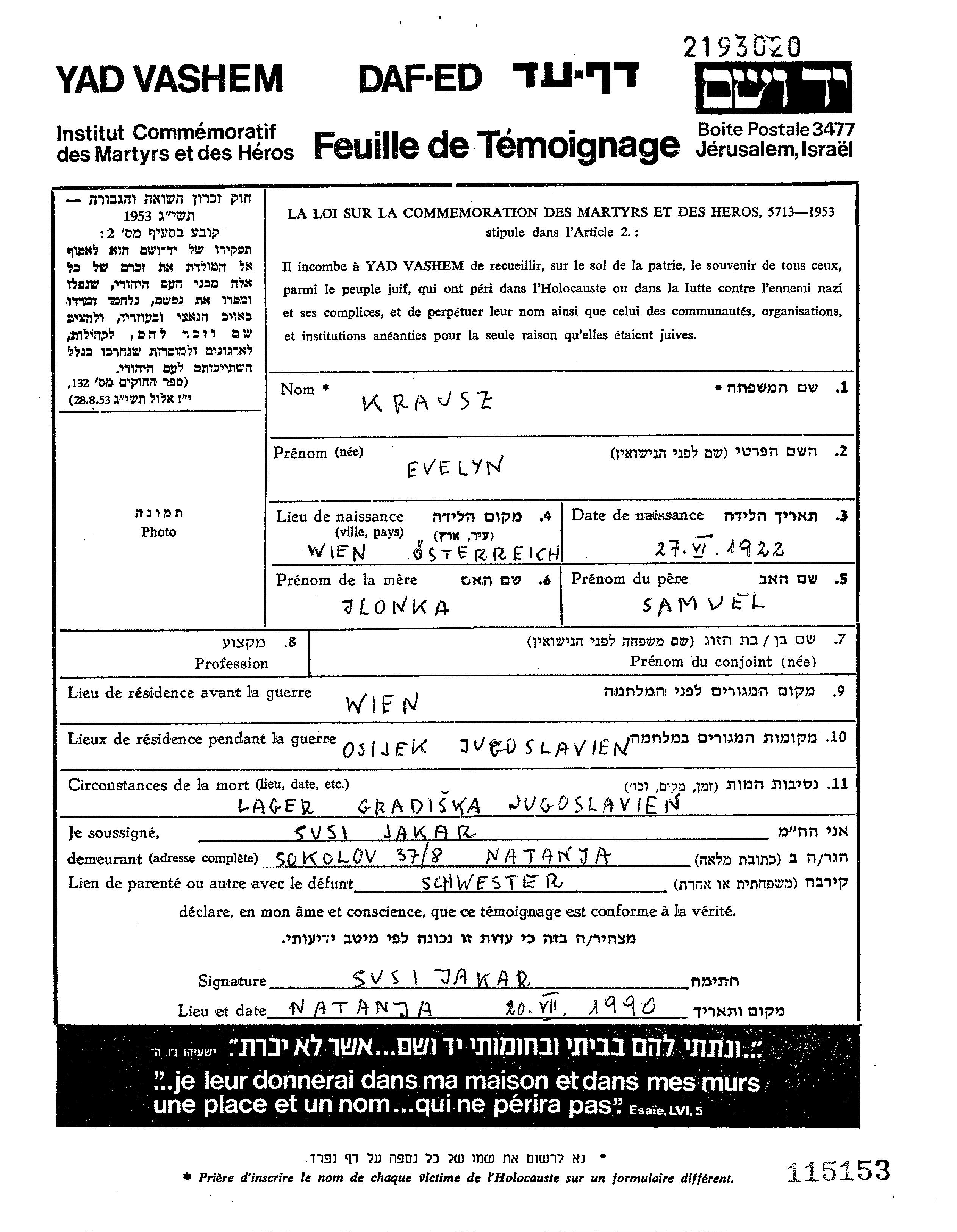 Эвелин Краус, место рождения: Вена, Австрия. Место жительства до войны: Осиек, Югославия.