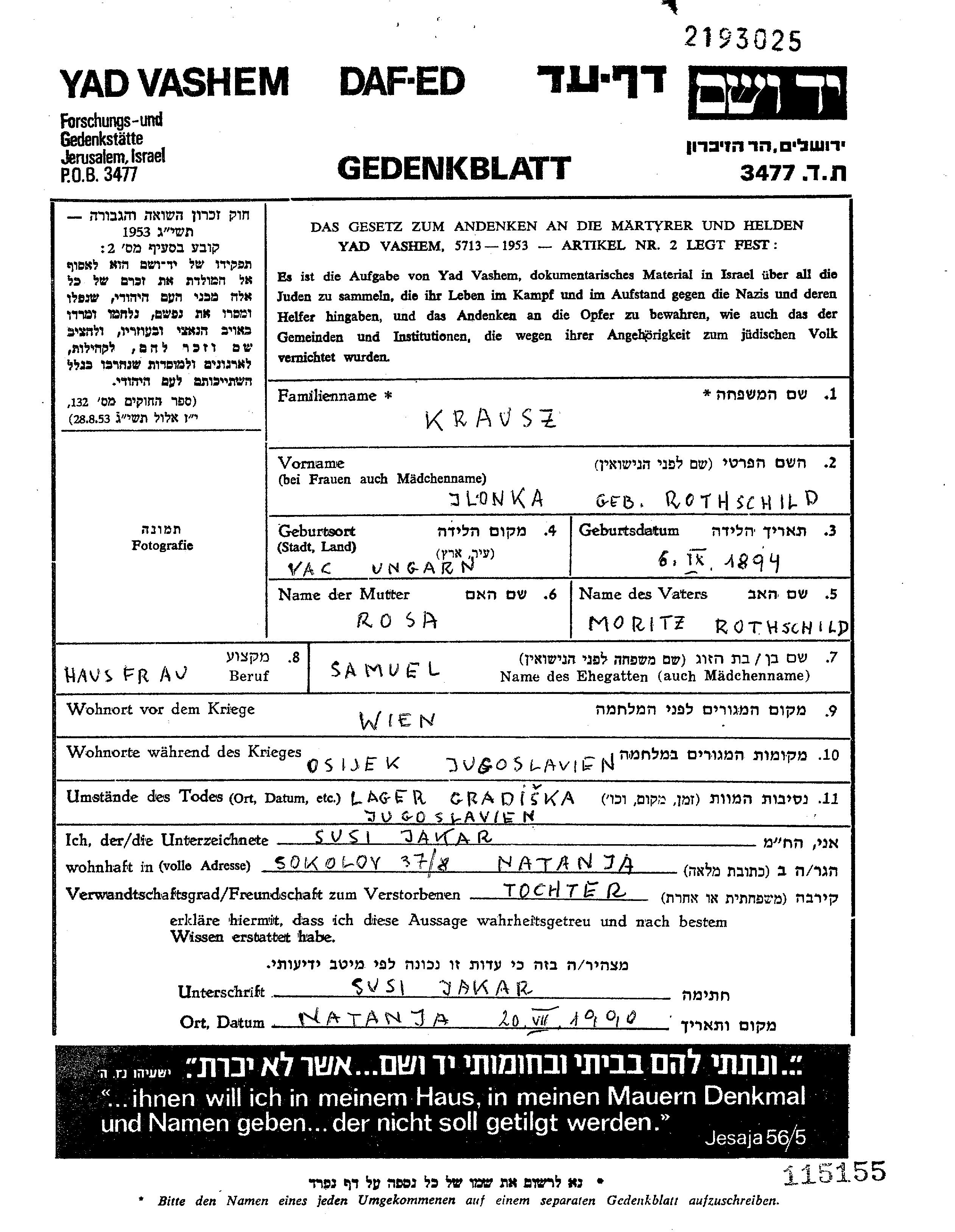 Илонка Краус, девичья фамилия Ротшильд, место рождения: Вац, Венгрия. Домохозяйка. Место жительства до войны: Осек, Югославия.