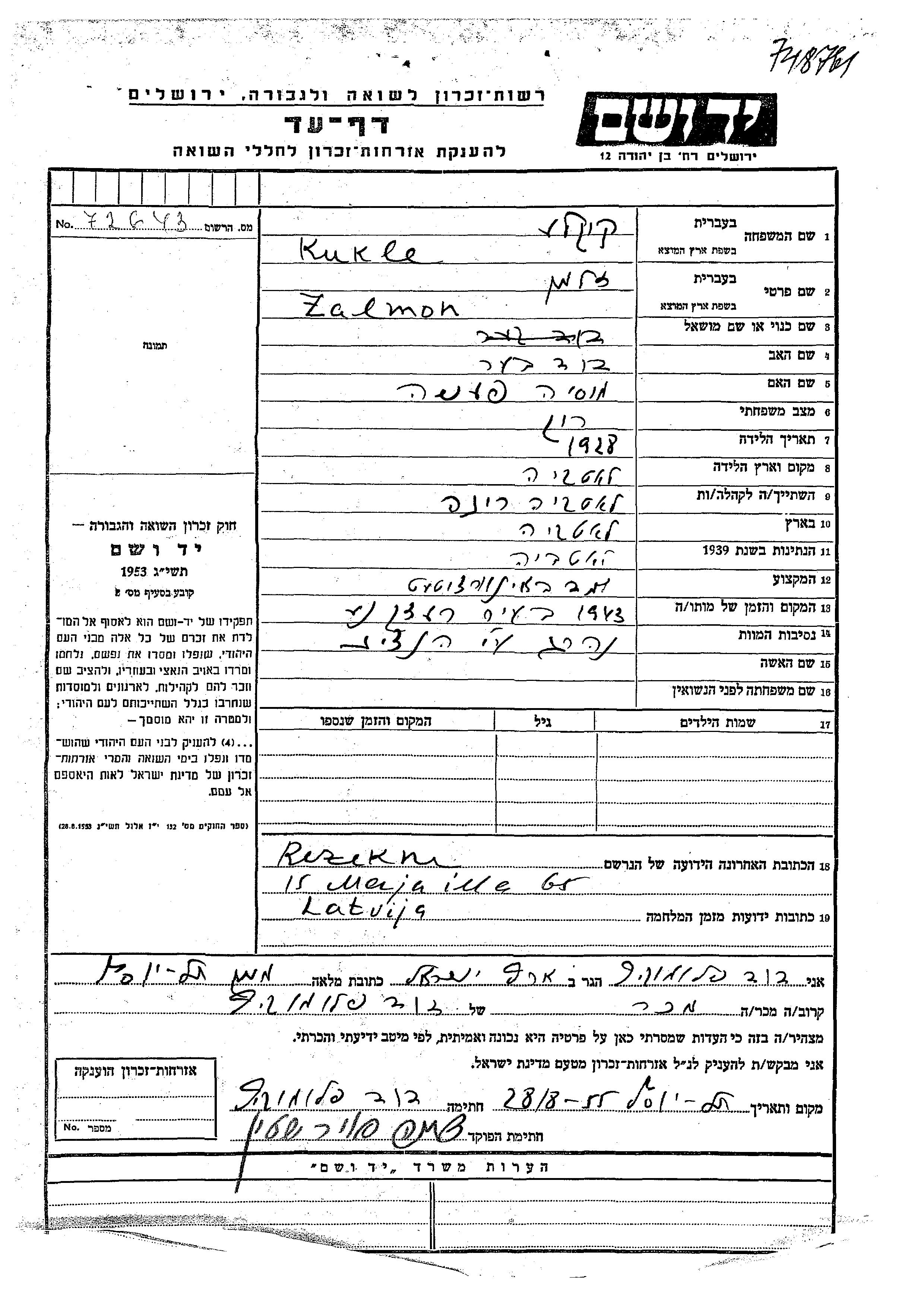 Кукле Залман 1928 Рига, Латвия Лист свидетельских показаний