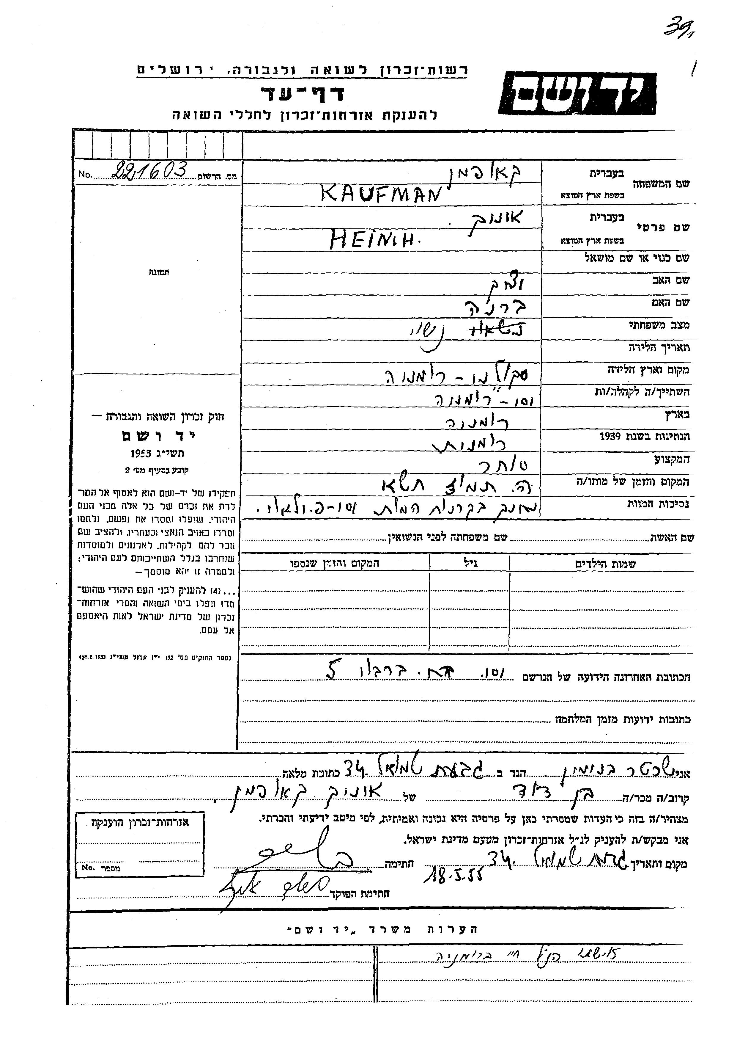Ханох Кауфман, место рождения: Скуляны, Румыния. Отец: Ицхак, mать:Брана. Торговец / торговка. Женат / замужем. Место жительства до войны: Яссы, Румыния.