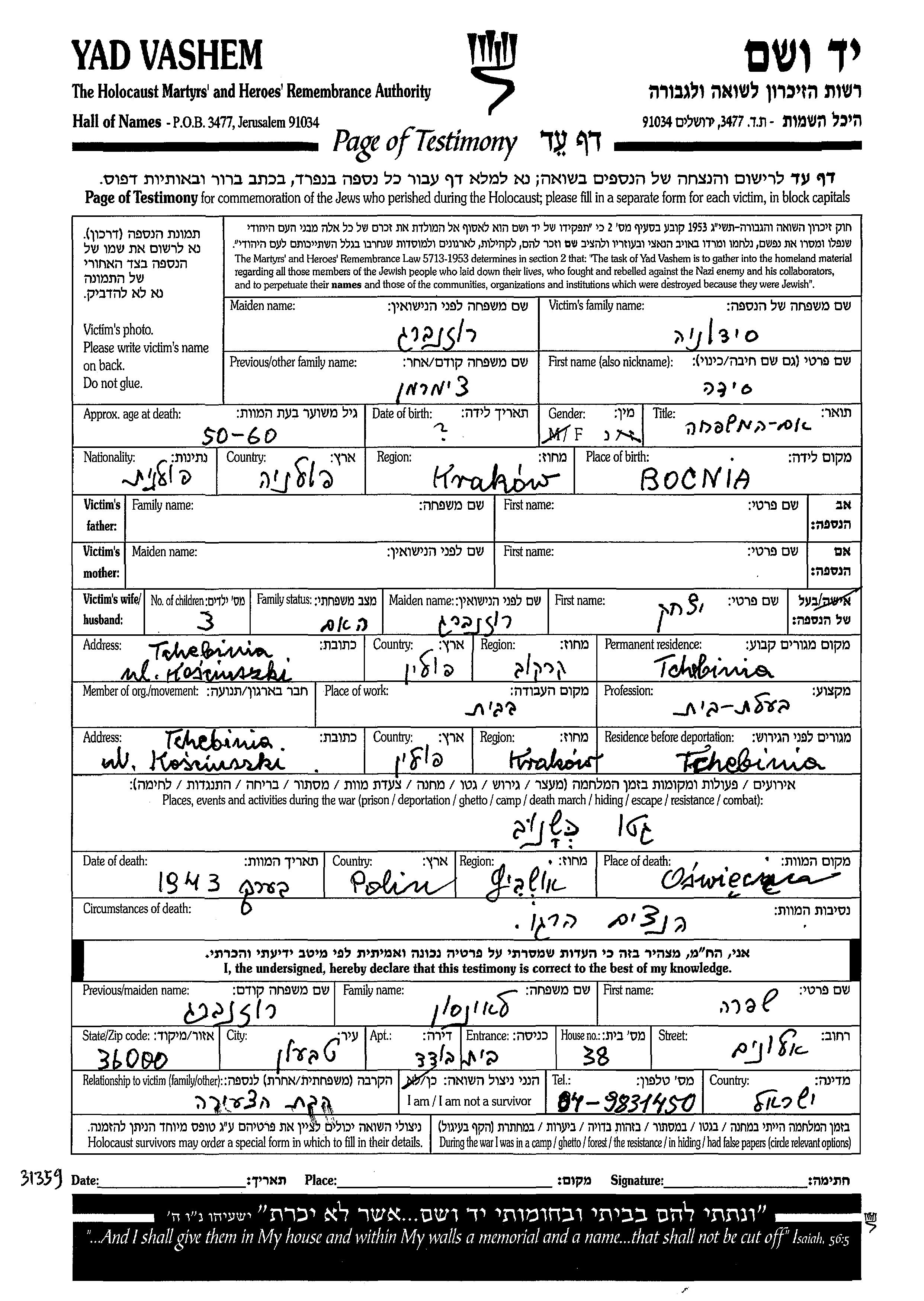 | Розенберг Лейнсон | Шифра | Тшебиня, Польша | Лист свидетельских показаний |