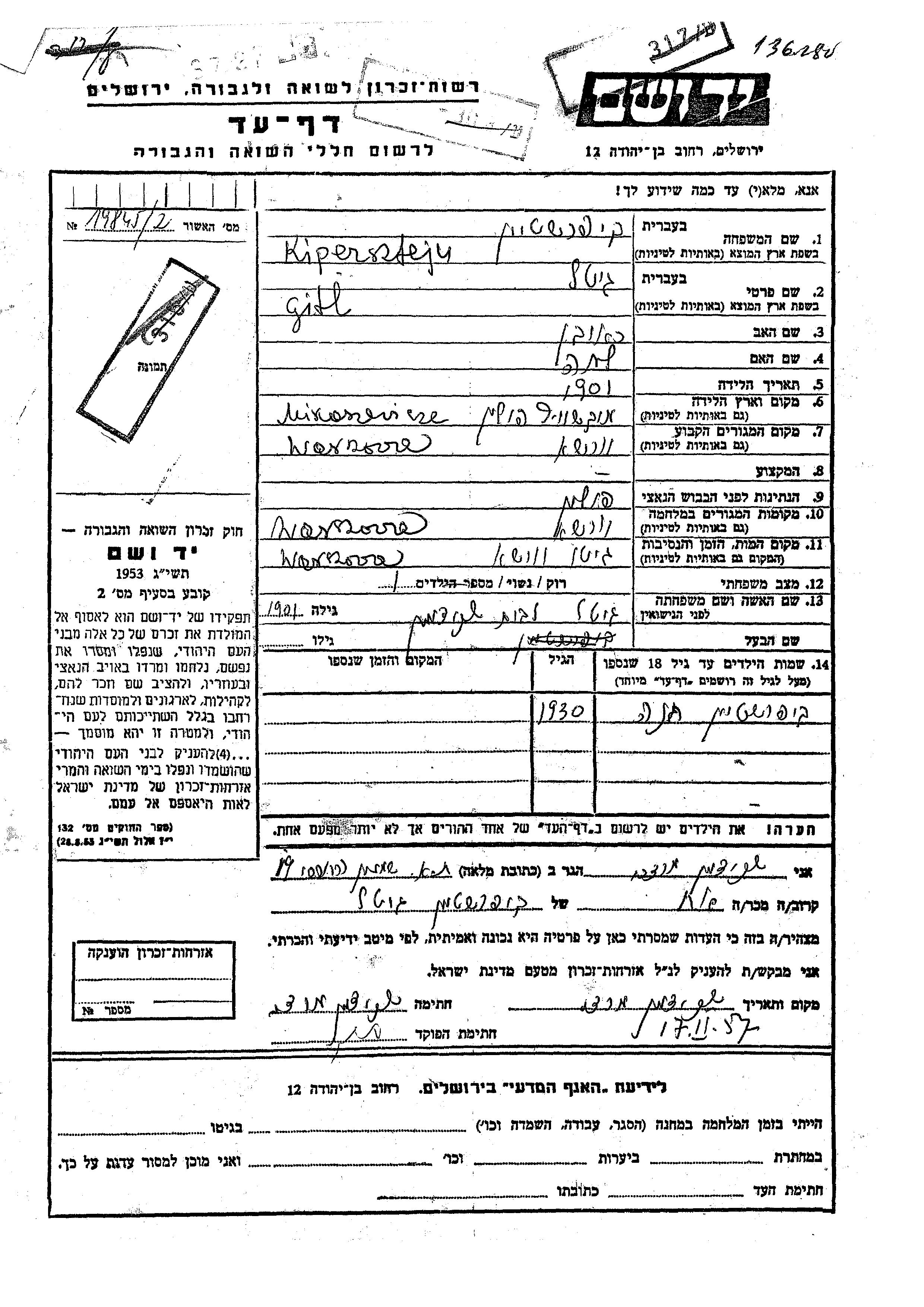 Гитл Киперштейн, девичья фамилия Шнейдерман, место рождения: Mikszawice, Польша. Отец: Реувен, mать:Лина. Женат / замужем. Место жительства до войны: Варшава, Польша. Место во время войны: Варшава, Польша.