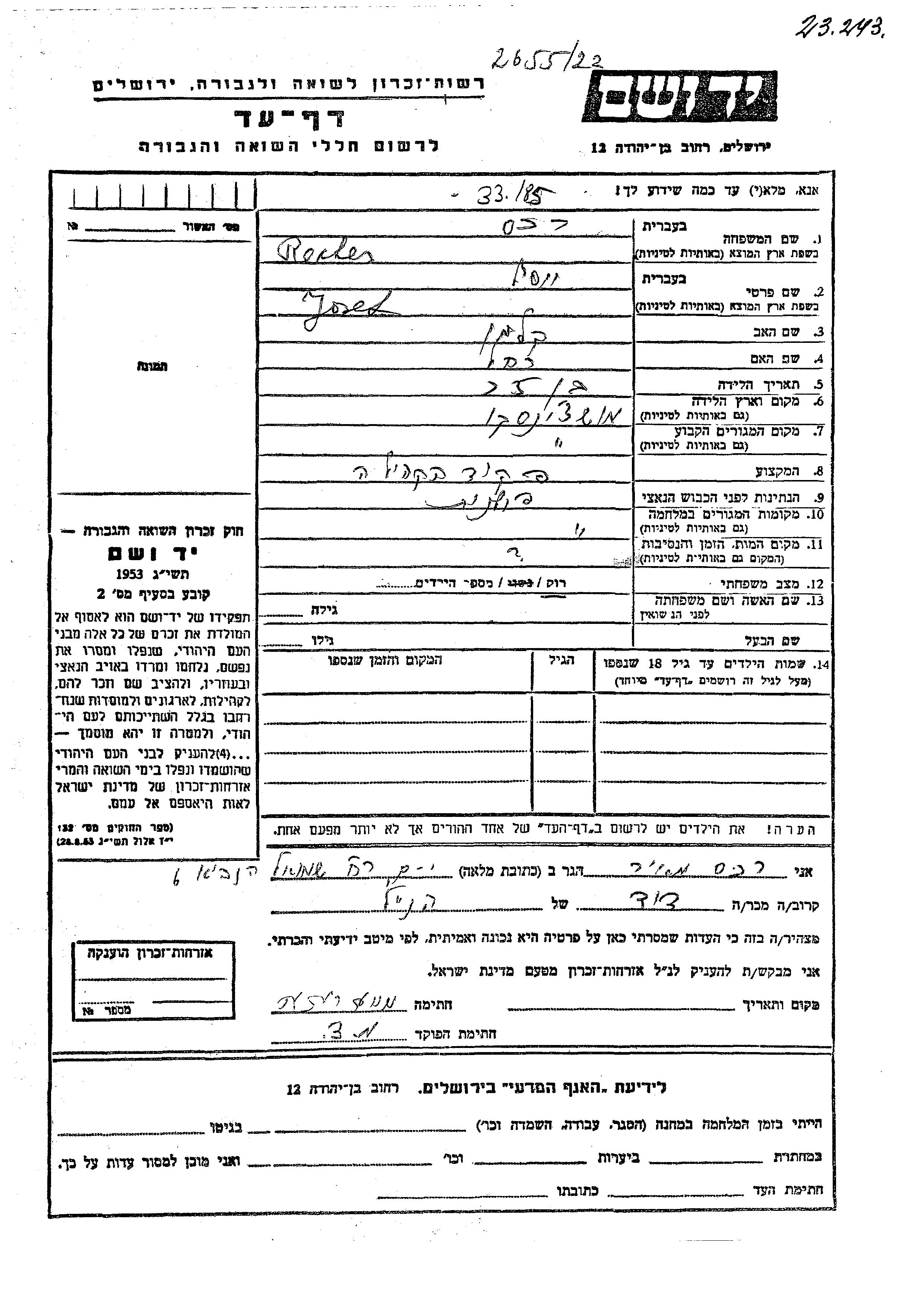 Яд Вашем - Листы свидетельских показаний Мемориального фонда