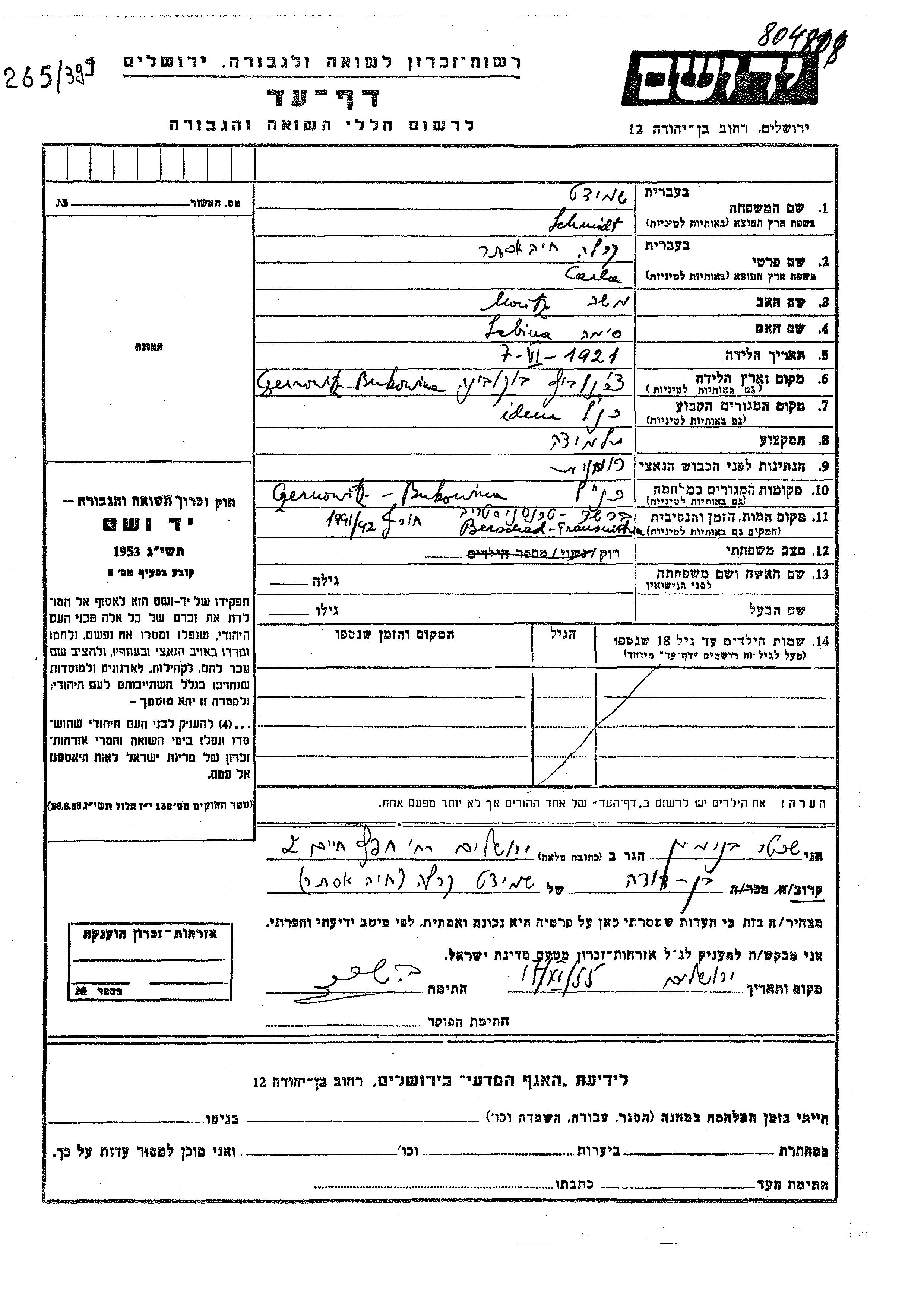 Шмидт Карла Хая Эстер 1921 Черновцы, Румыния Лист свидетельских показаний