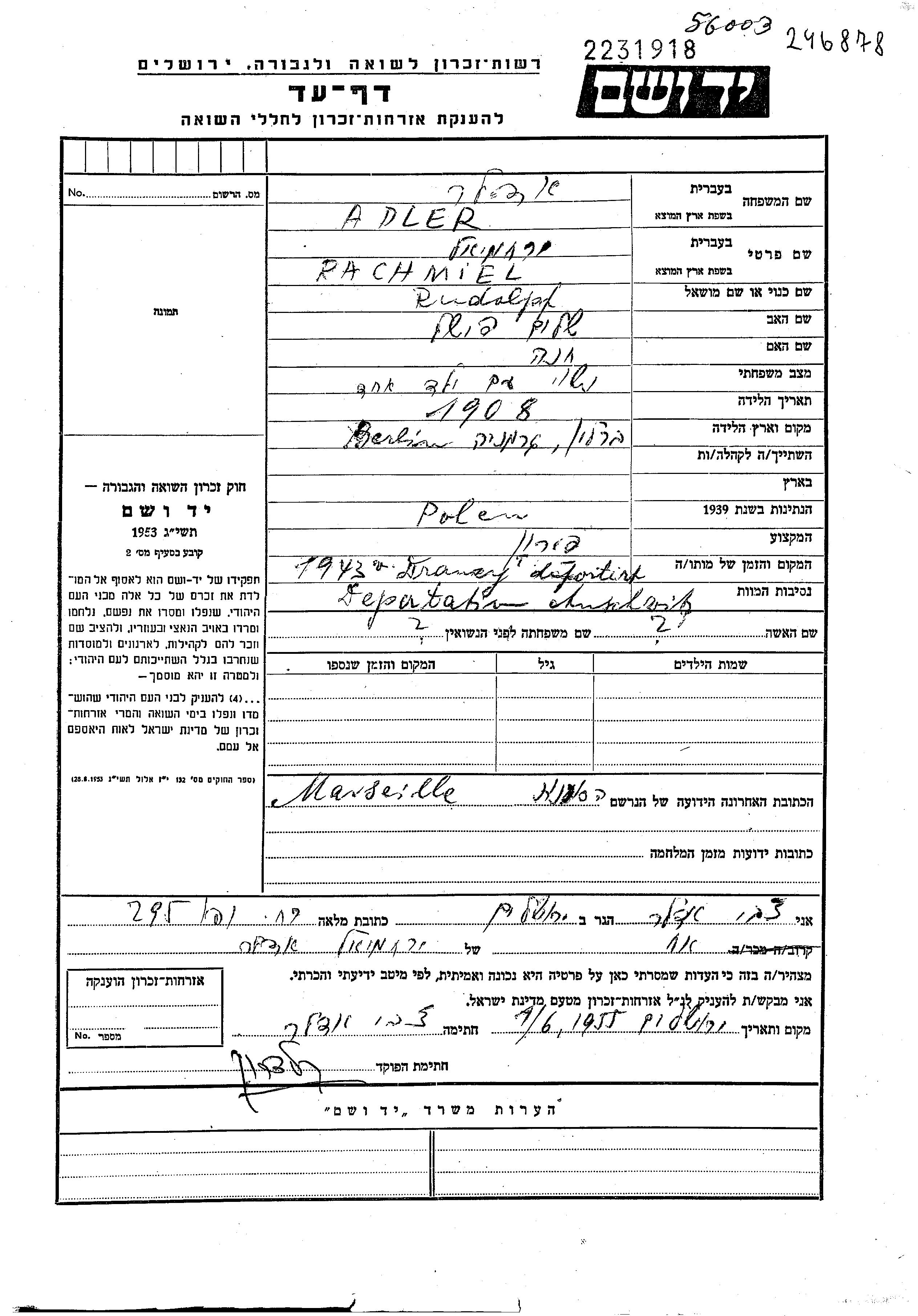 Адлер Иерахмиэль Рудольф 1908 Марсель, Франция Лист свидетельских показаний