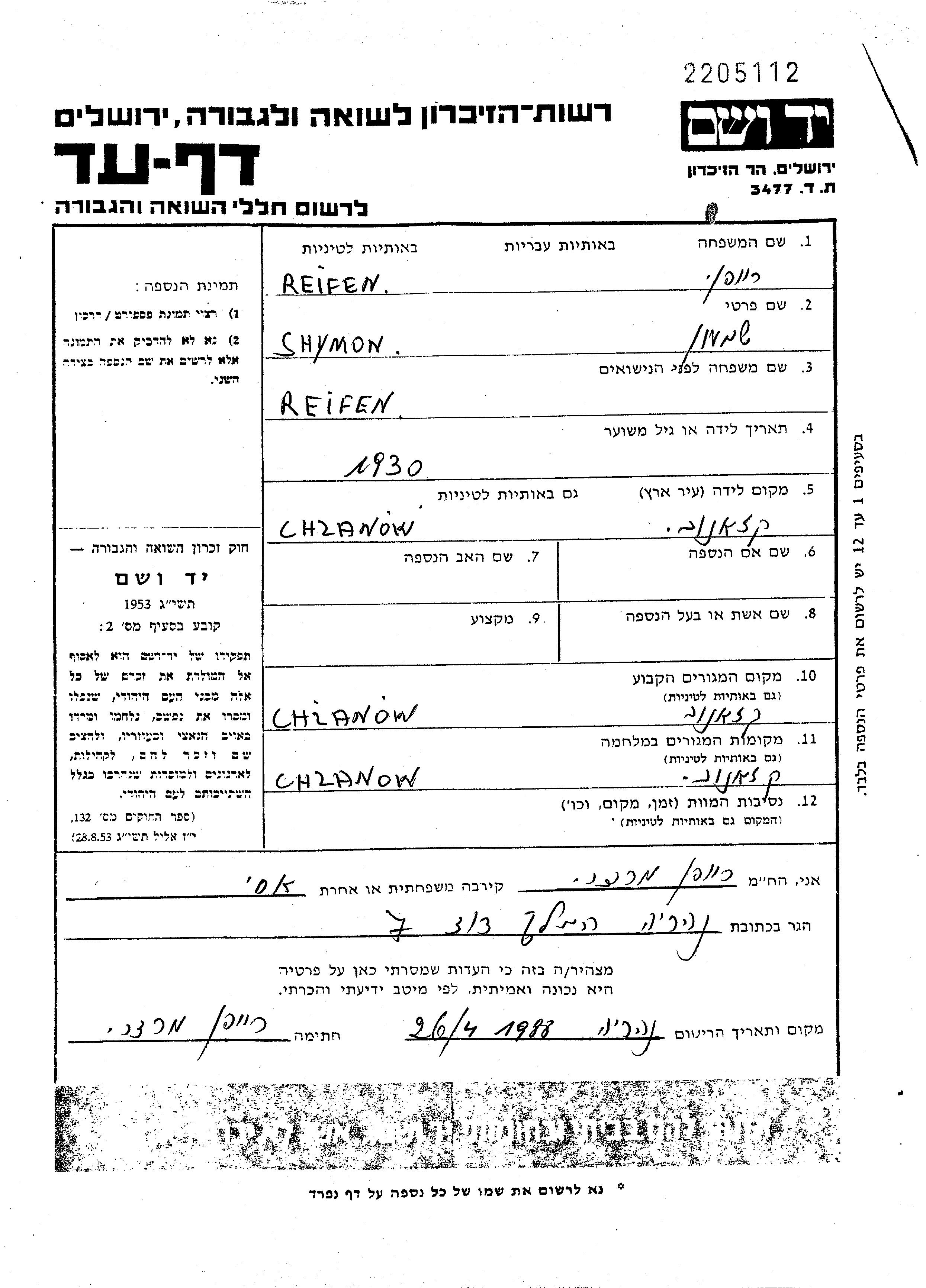 Рейфен Шимон 1931 Хшанув, Польша Лист свидетельских показаний
