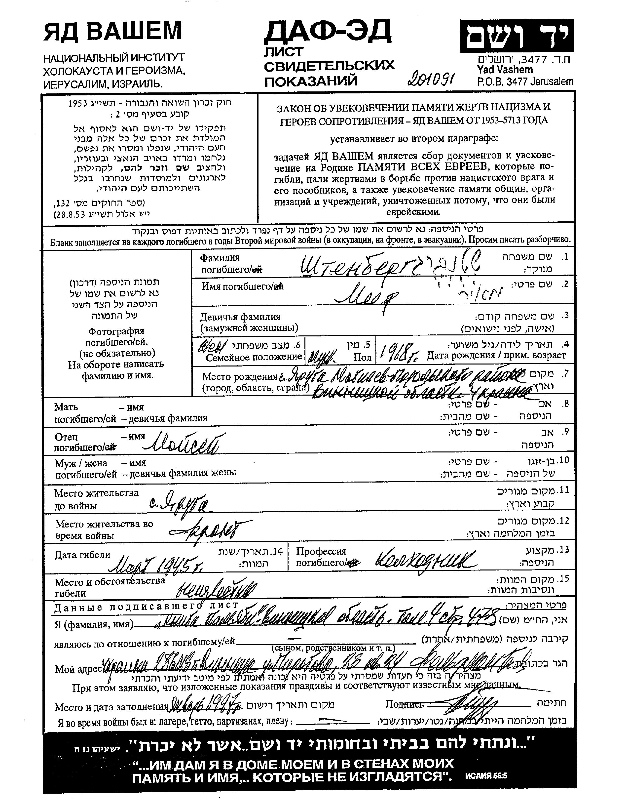 Штейнберг | Меир | 1918 | Яруга, Украина (СССР) | Лист свидетельских показаний |