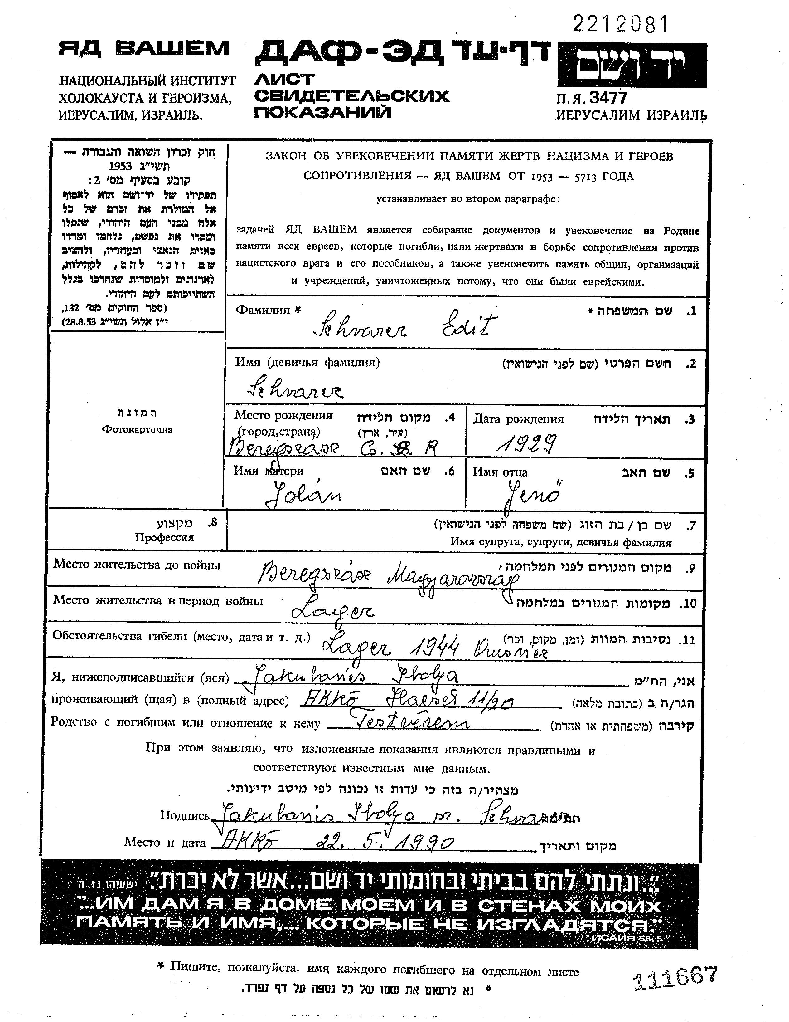 Шварц Эдит 1929 Берегсас, Чехословакия Лист свидетельских показаний