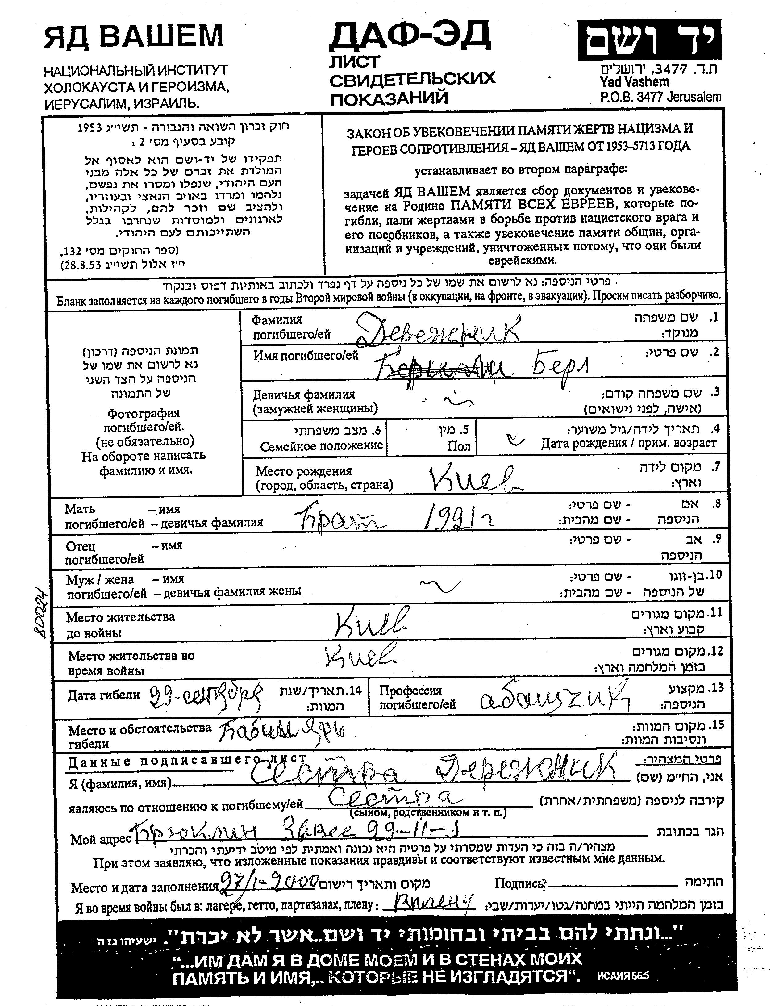 Дерезник Борис 1921 Киев, Украина (СССР) Лист свидетельских показаний