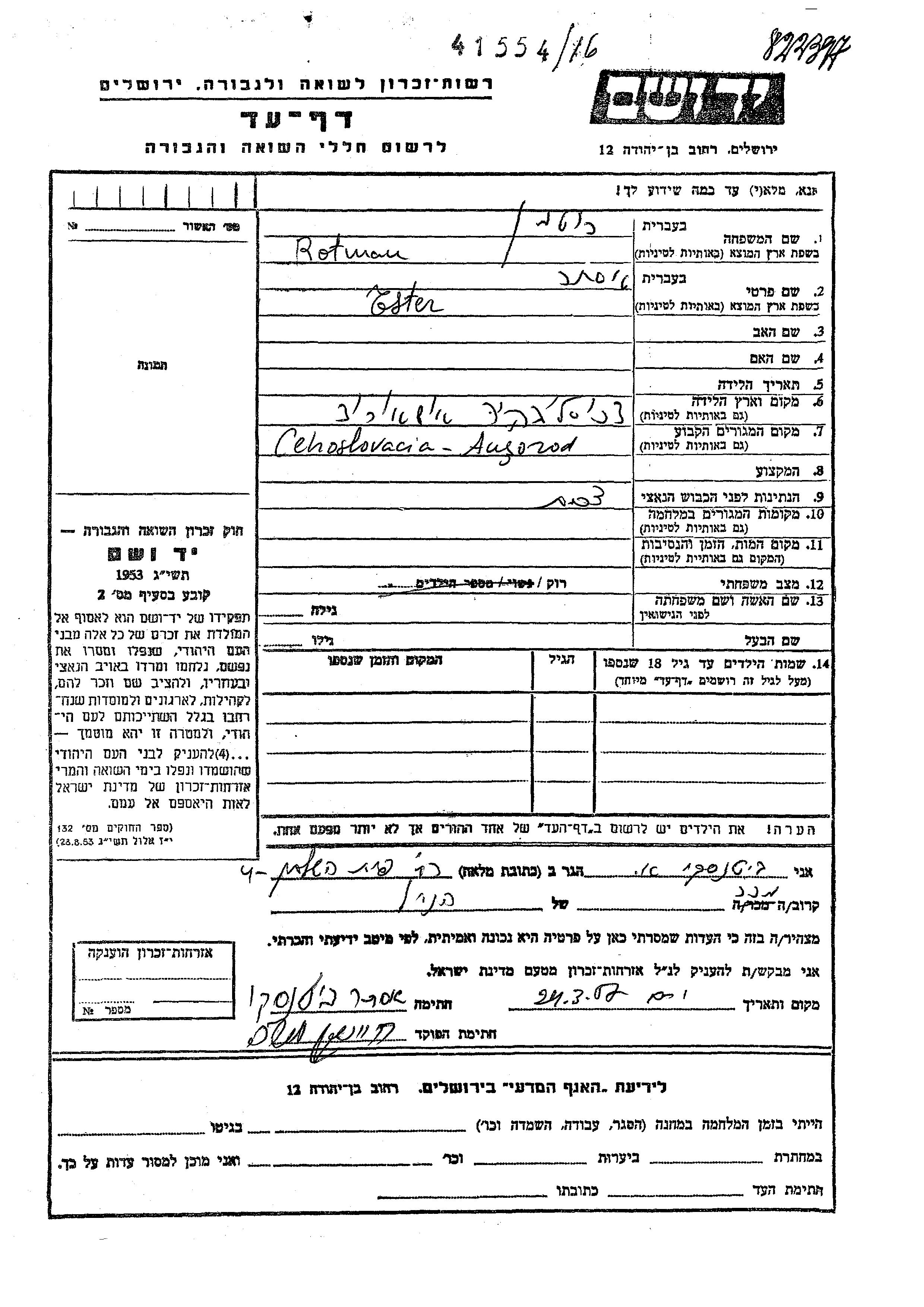 Ротман Эстер Ужгород, Чехословакия Лист свидетельских показаний