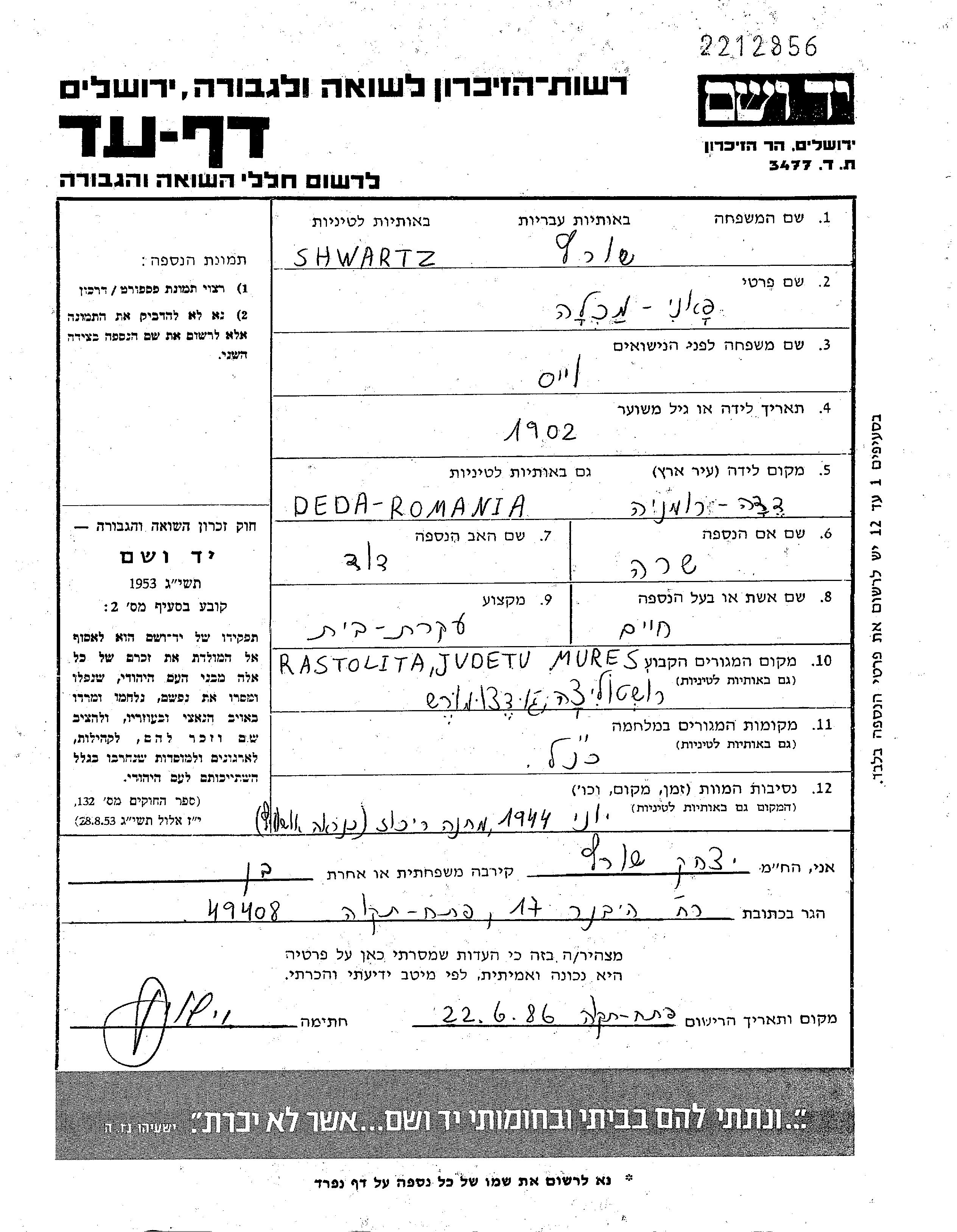 Шварц Фани 1902 Деда, Румыния Лист свидетельских показаний