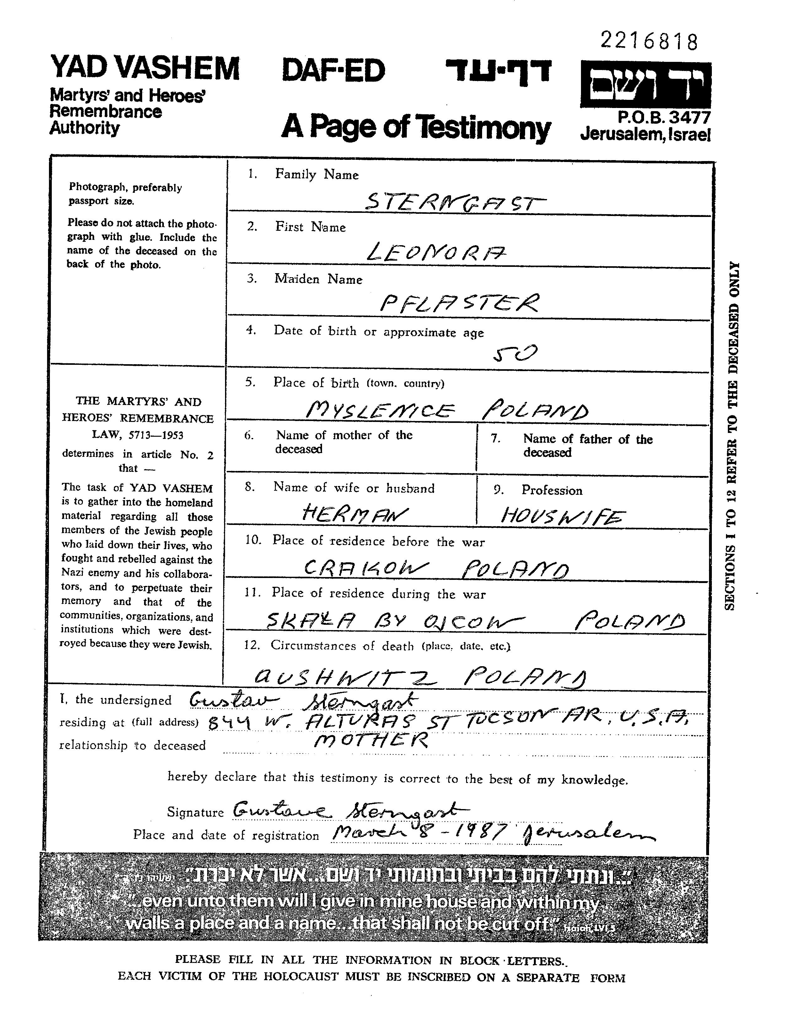 Штернгаст Леонора Краков, Польша Лист свидетельских показаний