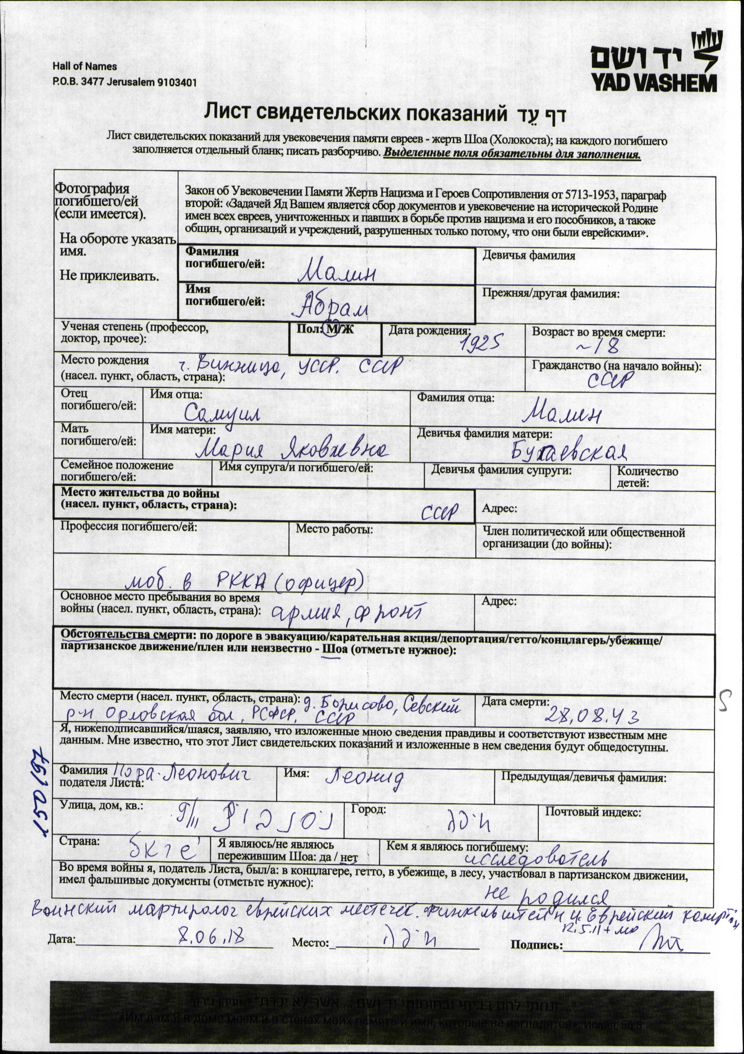 | Малин | Абрам | 1925 | СССР | Лист свидетельских показаний |