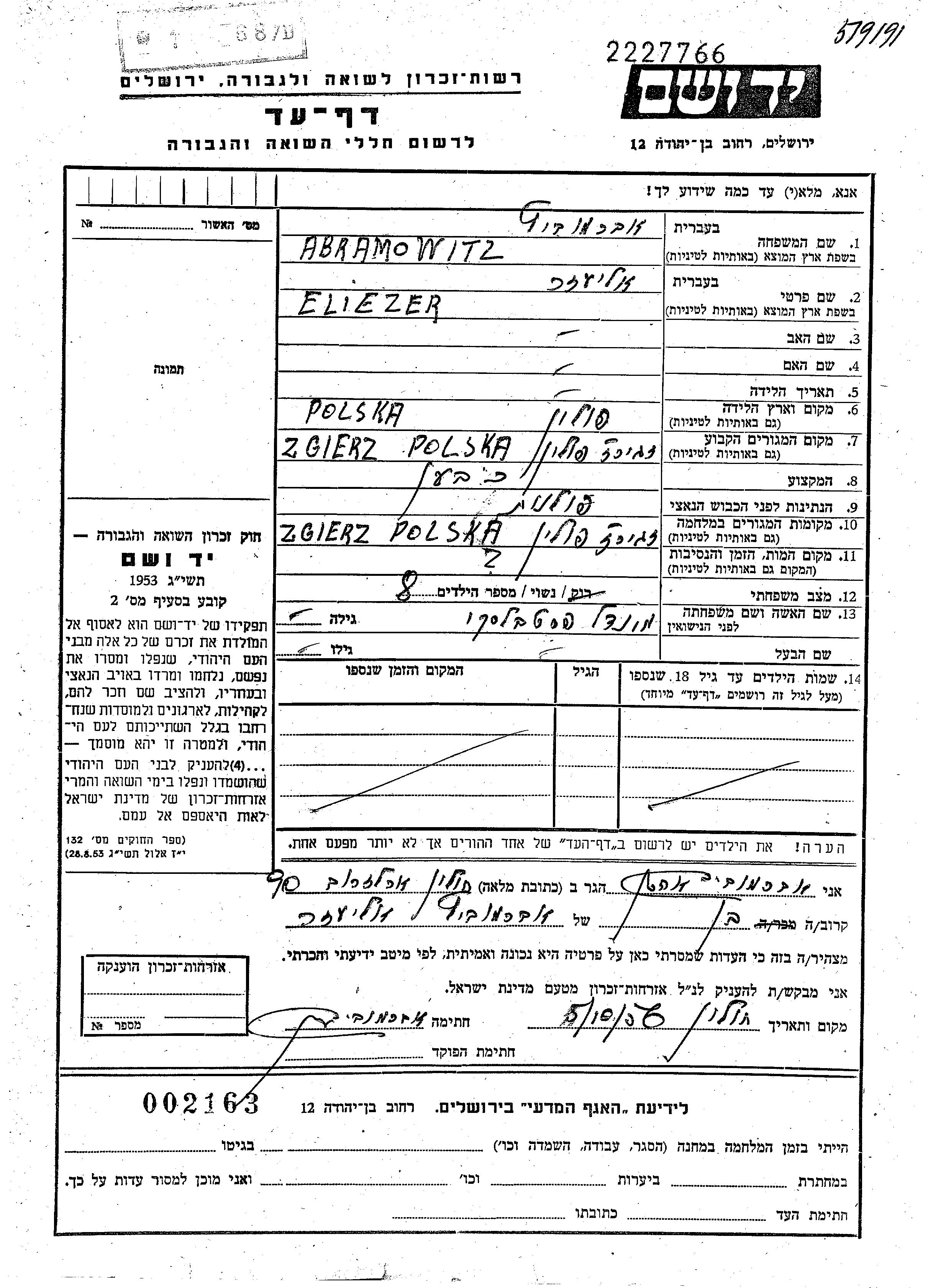 Абрамовиц | Элиэзер | Згеж, Польша | Лист свидетельских показаний | |
