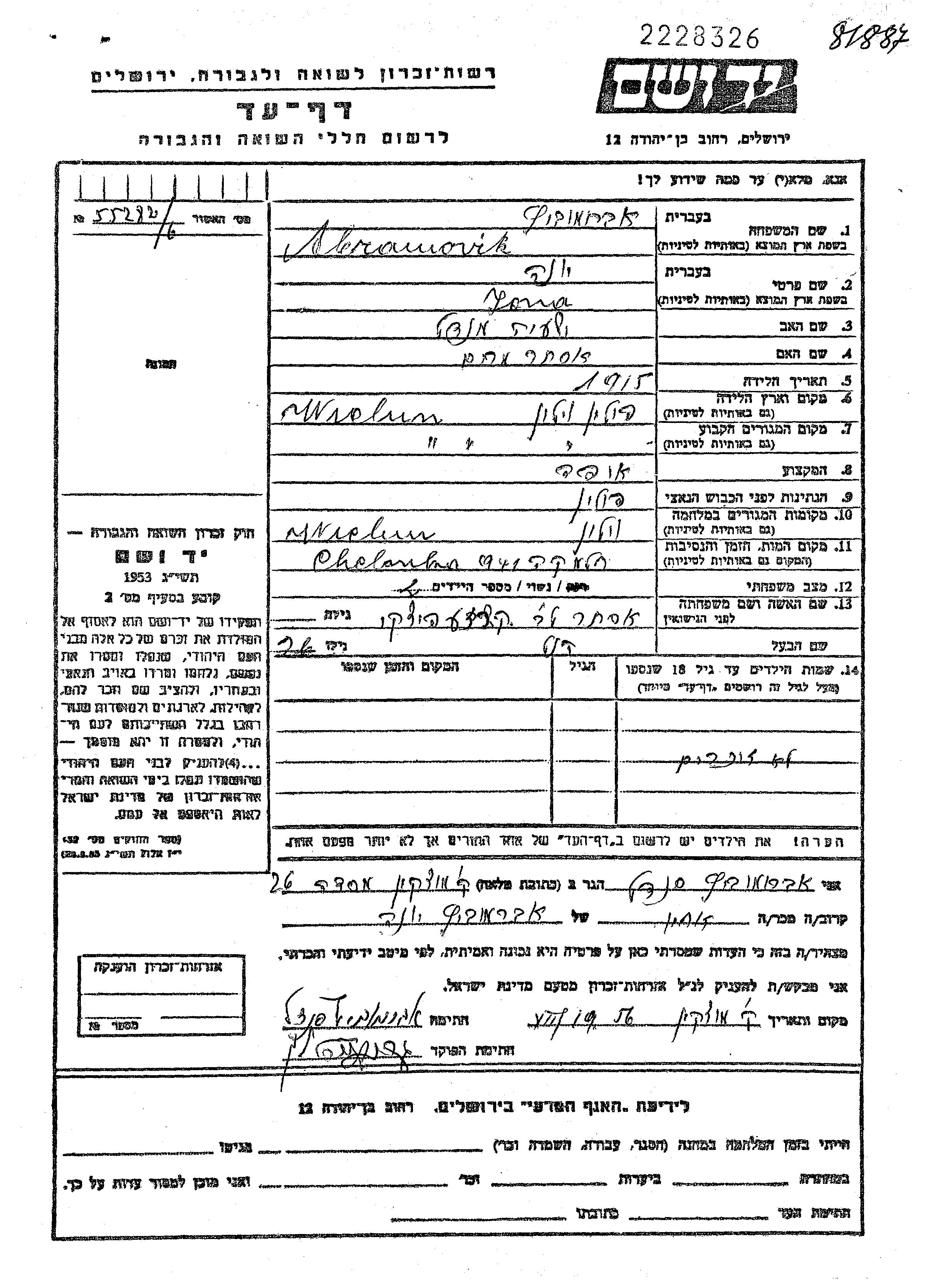 Яд Вашем - Листы свидетельских показаний Мемориального фонда
