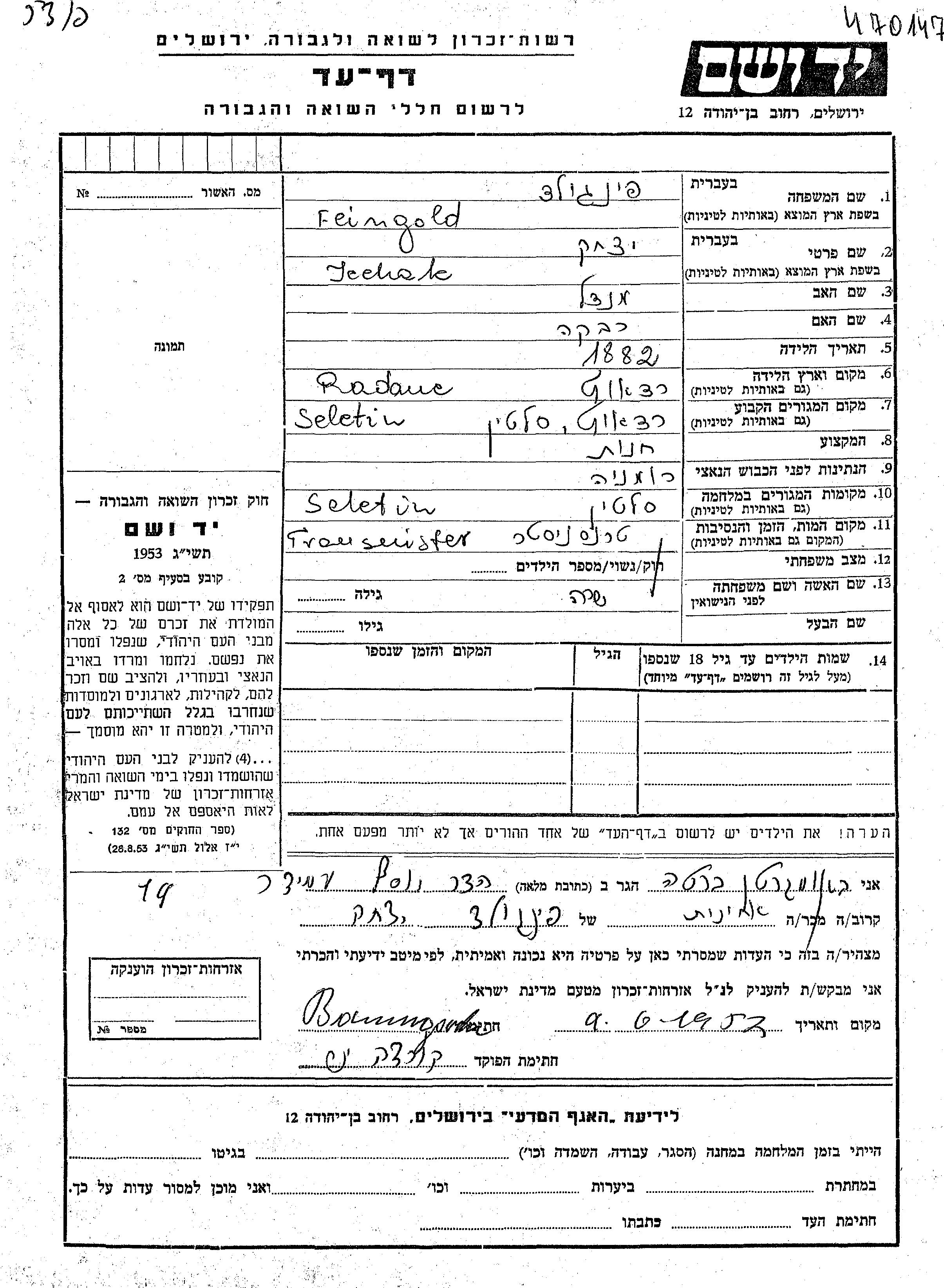 Ицхак Фейнгольд, место рождения: Радауц, Румыния. Отец: Мендель, mать:Ривка. Женат / замужем. Место жительства до войны: Селятин, Румыния. Место во время войны: Селятин, Румыния.