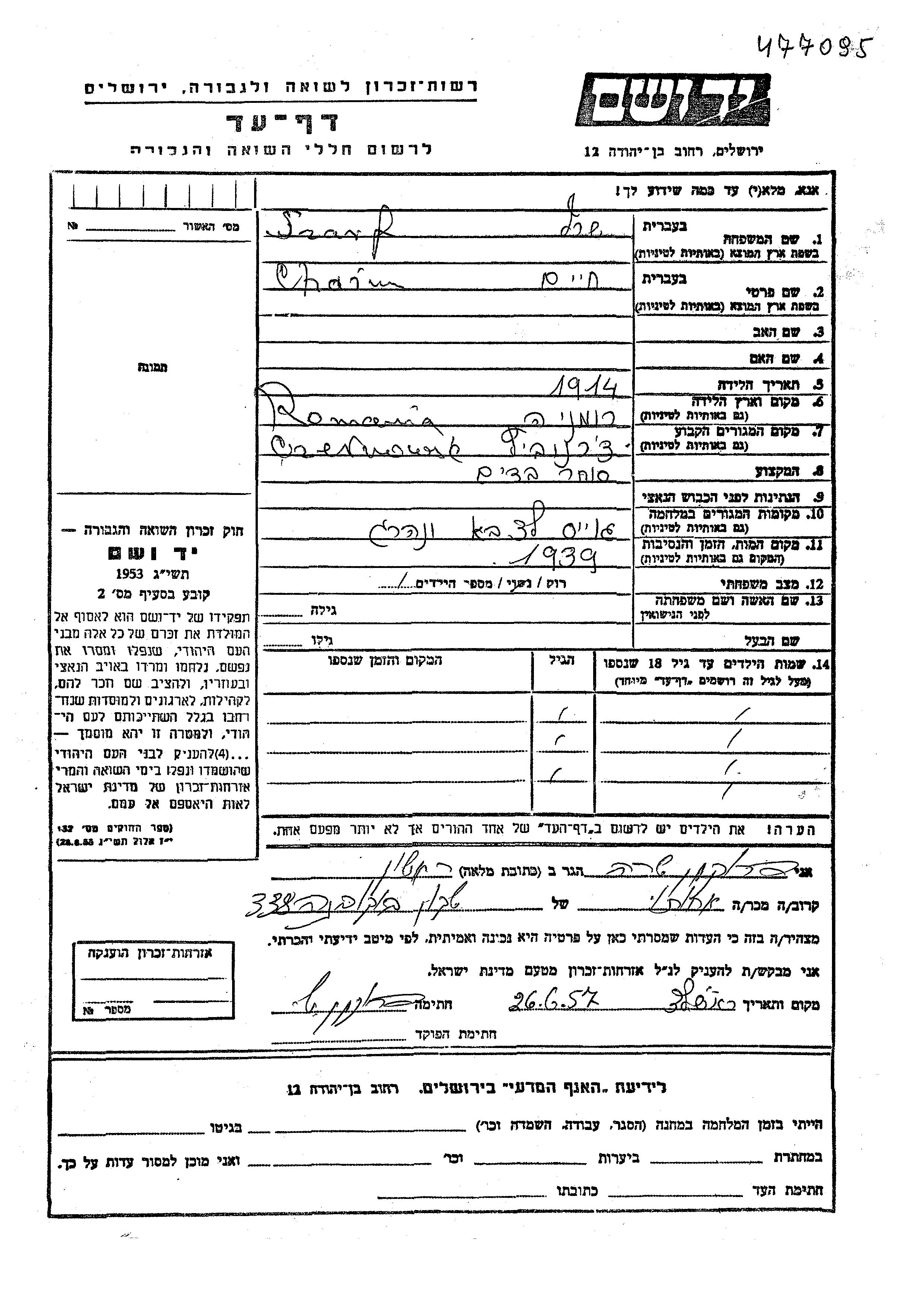Хаим Шарф, место рождения: Румыния. Торговец текстилем. Холост / не замужем. Место жительства до войны: Черновцы, Румыния. Место во время войны: Вооруженные силы Советского Союза. Хаим погиб на военной службе. место смерти: неизвестно в 1939.