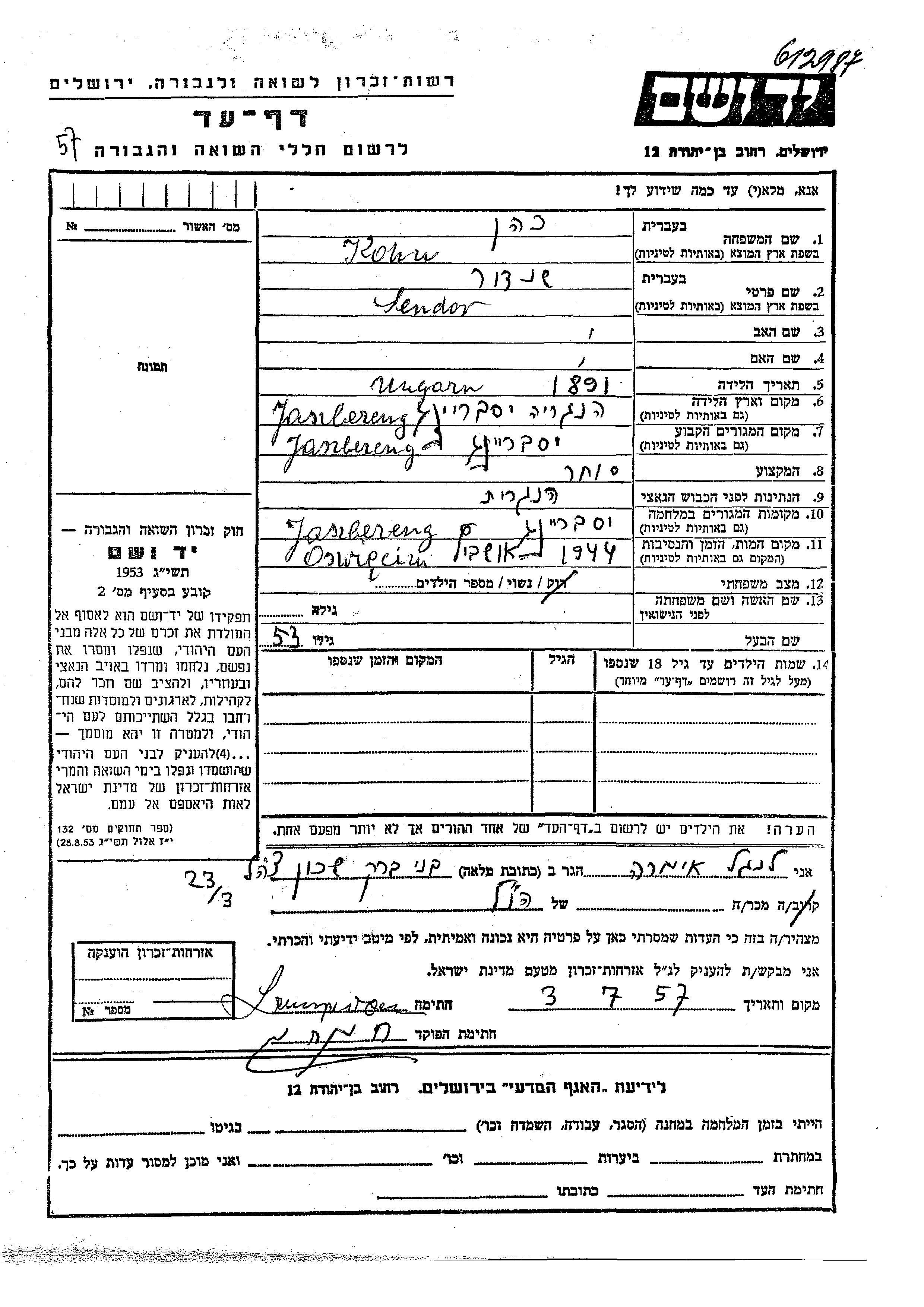 Сендор уничтожен в период Шоа. место смерти: Аушвиц, Польша в 1944.