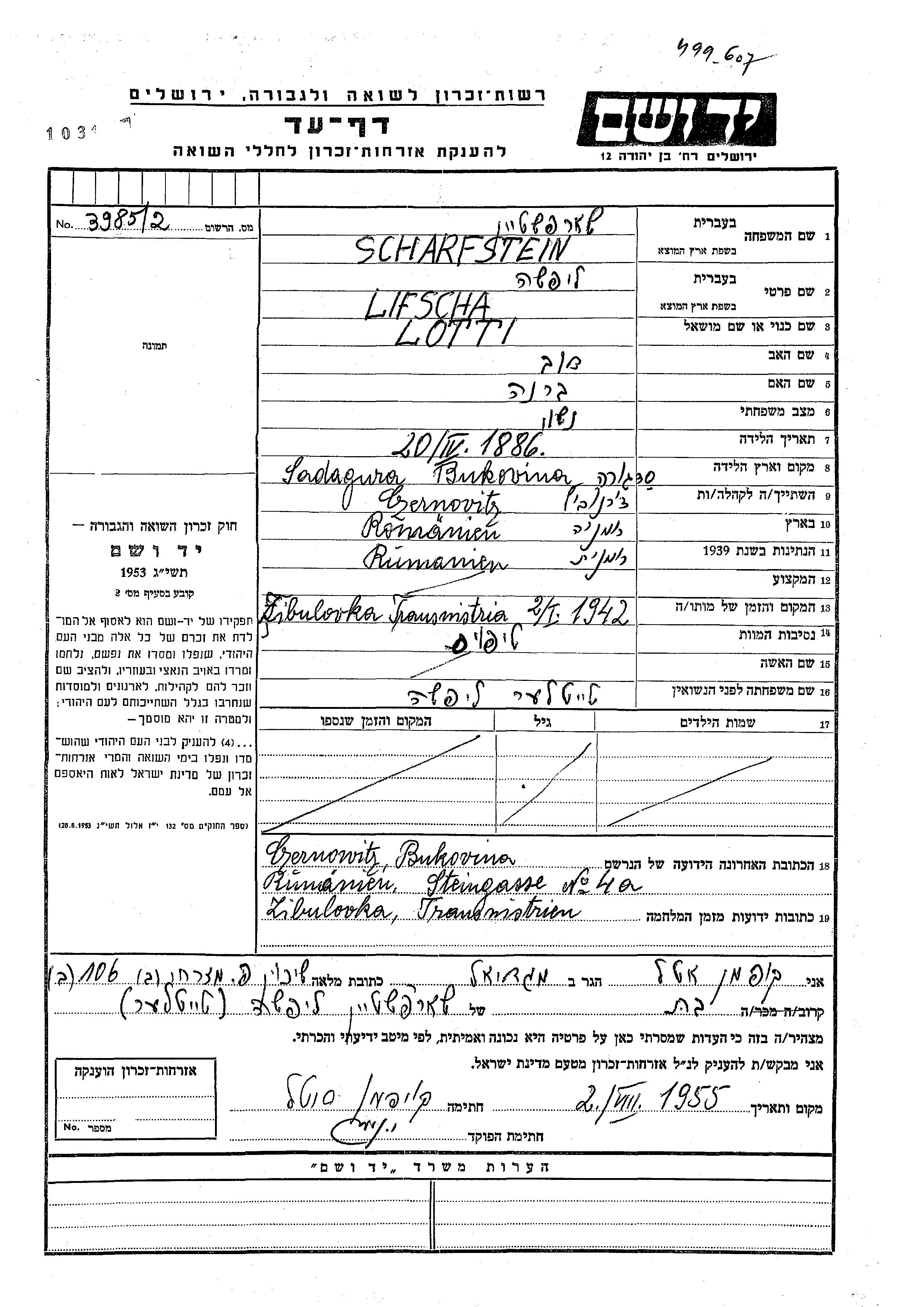 Липша Лотти Шарфштайн, девичья фамилия Тейтлер, место рождения: Садагура, Румыния. Отец: Дов, mать:Брана. Женат / замужем. Место жительства до войны: Черновцы, Румыния. Место во время войны: Цыбулёвка, Украина (СССР).