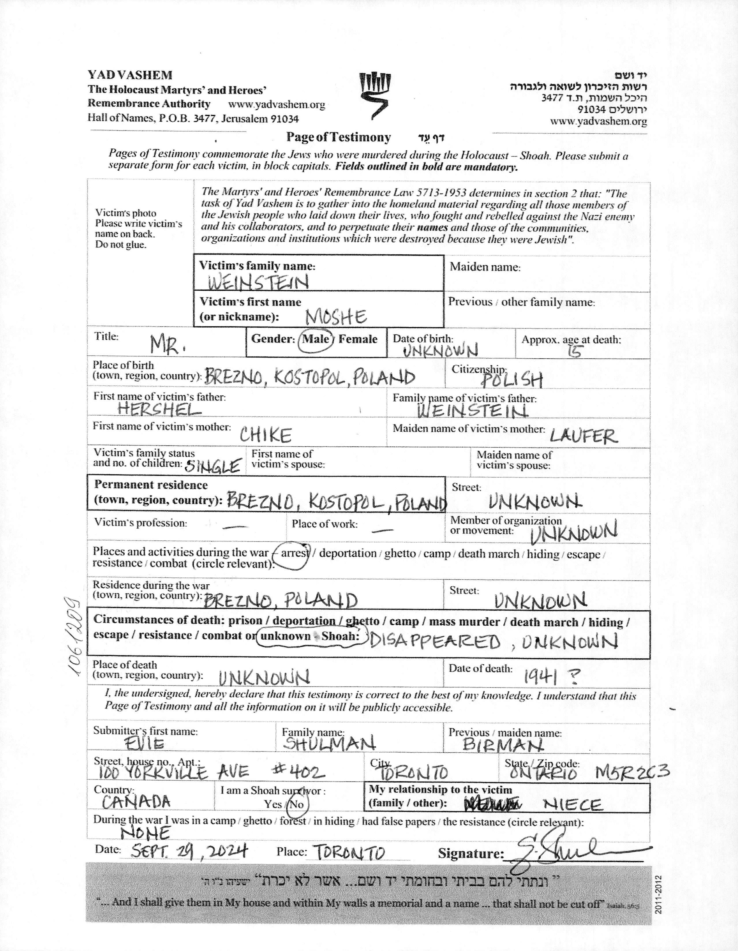 Моше Вейнштейн, место рождения: Брезно, Польша. Отец: Гершель, mать:Хая, девичья фамилия Лауфер. Ребенок. Место жительства до войны: Брезно, Польша. Место во время войны: Брезно, Польша.