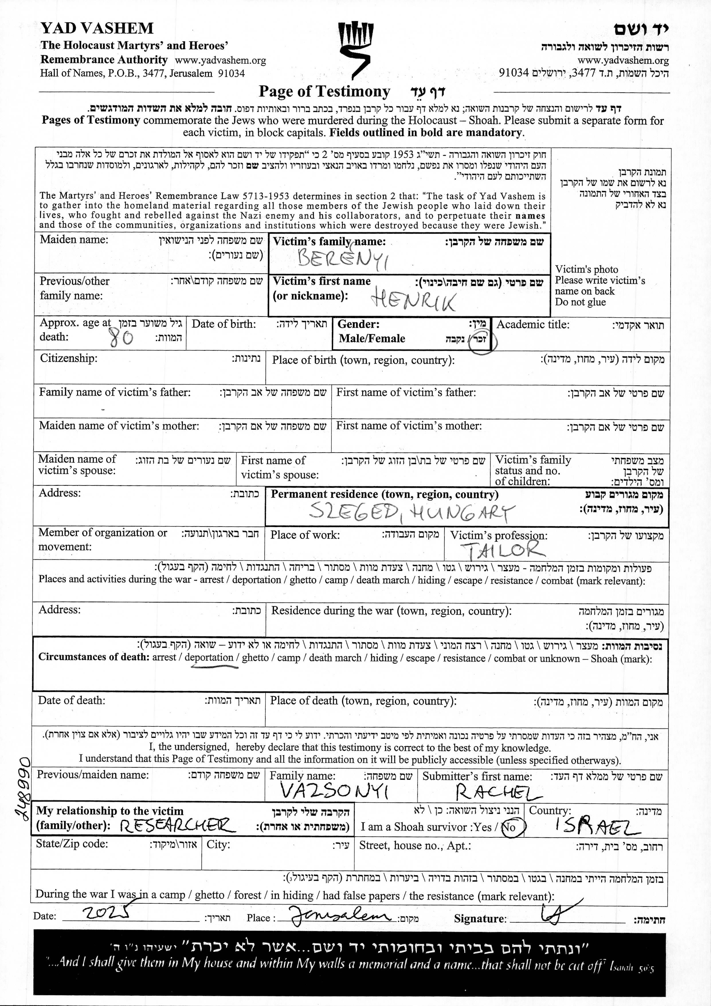 Береньи Генрик Сегед, Венгрия Лист свидетельских показаний