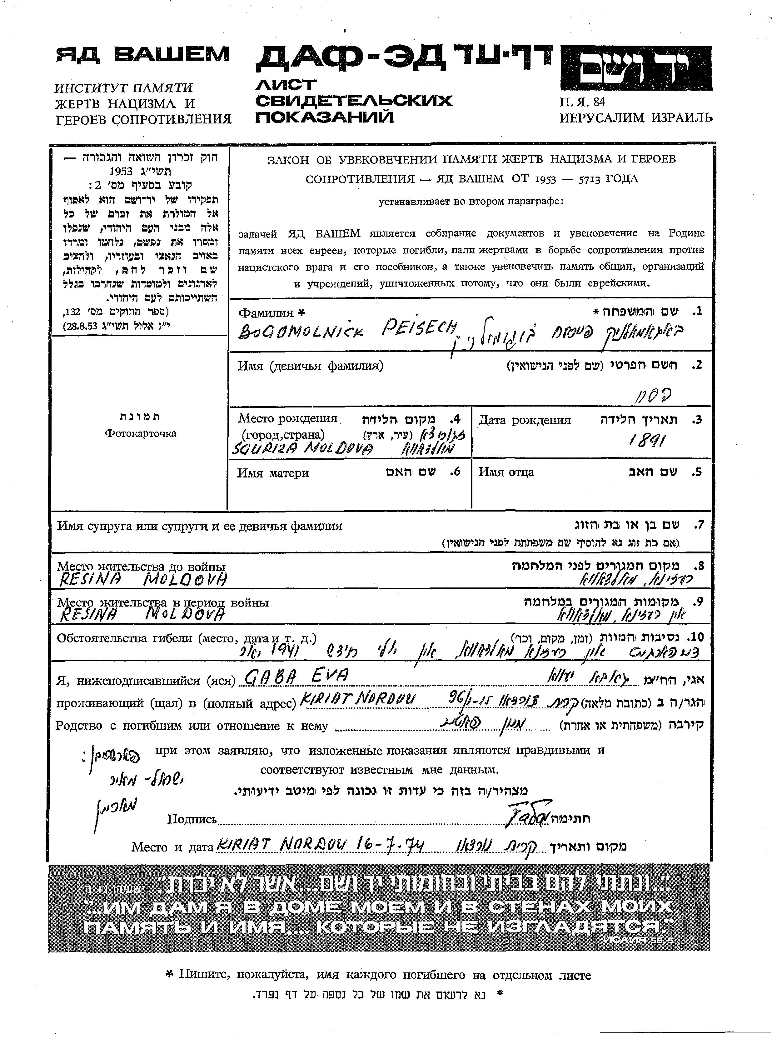 Пейсех Богомолник, место рождения: Згурица, Румыния. Женат / замужем. Место жительства до войны: Резина, Румыния. Место во время войны: Резина, Румыния.