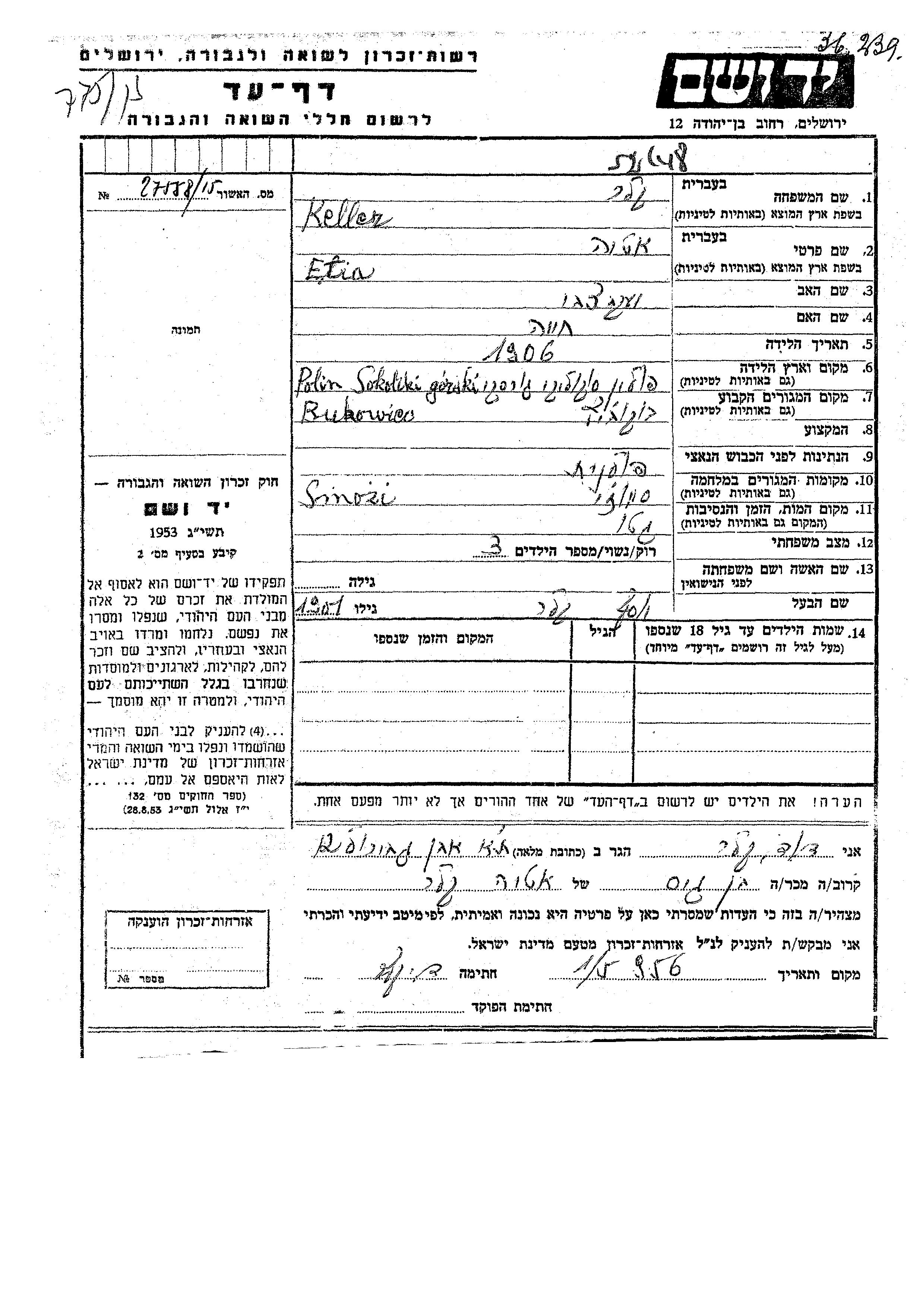 Келлер Этя 1906 Буковец, Польша Лист свидетельских показаний