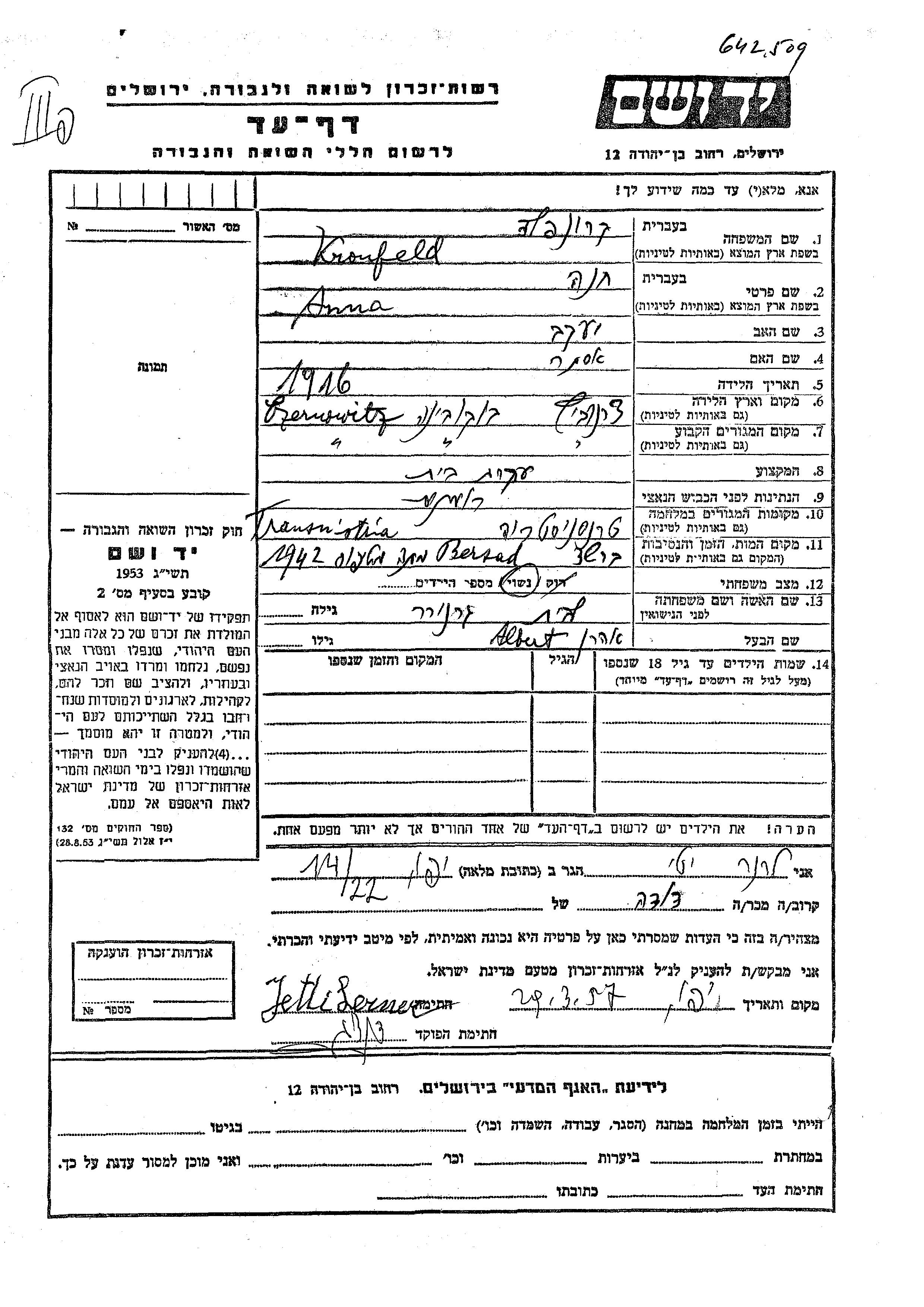 Кронфельд Анна Хана 1916 Черновцы, Румыния Лист свидетельских показаний